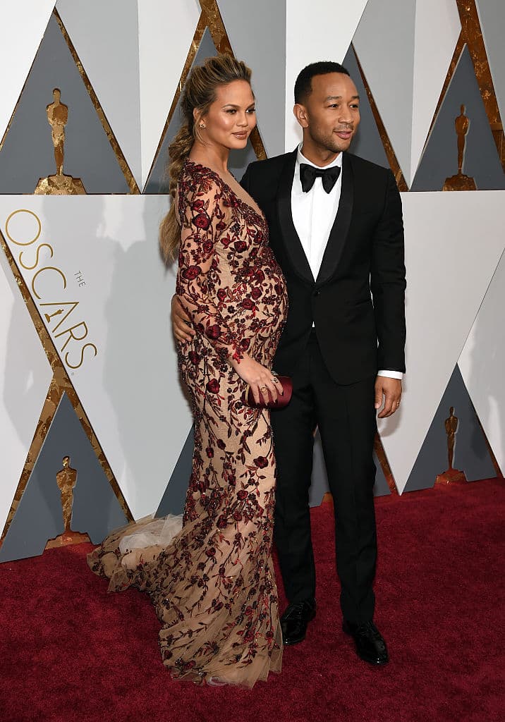 No obstante, antes de sus atuendos llenos de brillos y destellos, Teigen había lucido un hermoso vestido Marchesa en su primer embarazo en 2016, específicamente en la red carpet de los Premios Oscar.