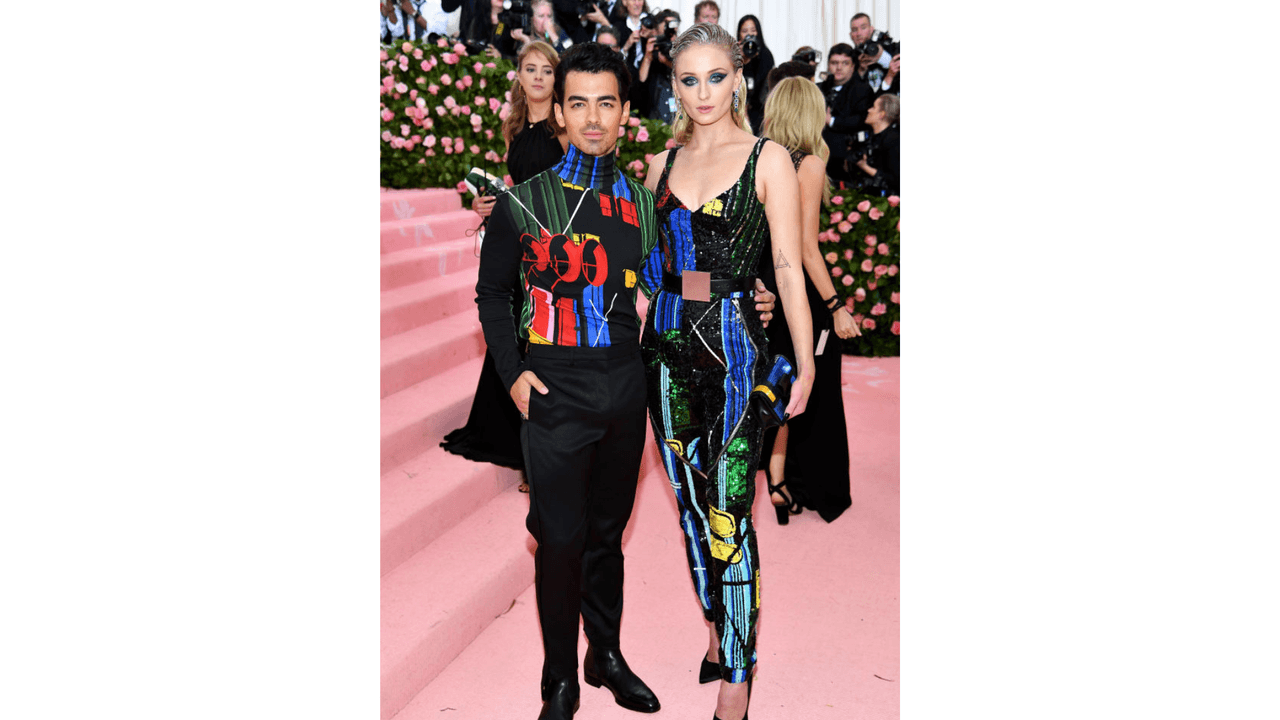 Sophie portó de manera elegante un mono sin mangas y con zapatillas negras, a su vez Joe escogió una camisa muy colorida de cuello de tortuga.