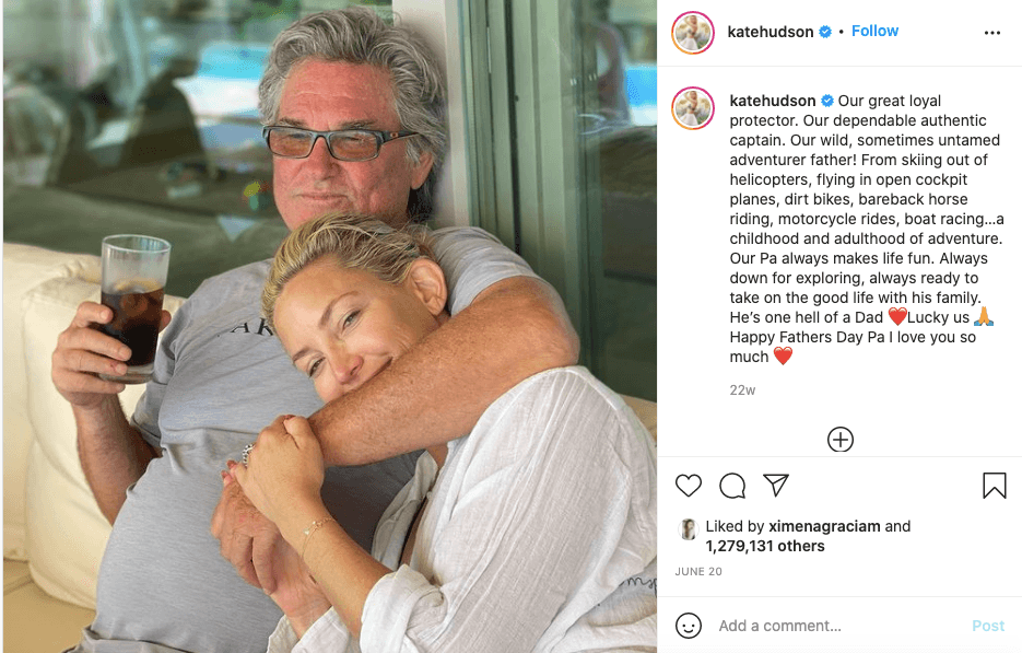 Los artistas no tuvieron una relación cercana con su padre, por lo que Kurt Russell se convirtió en su figura paterna. En el día del padre de 2021, Kate Hudson compartió una tierna imagen a lado del intérprete recordando las aventuras que han vivido juntos, describiéndolo como “su leal y gran protector”.