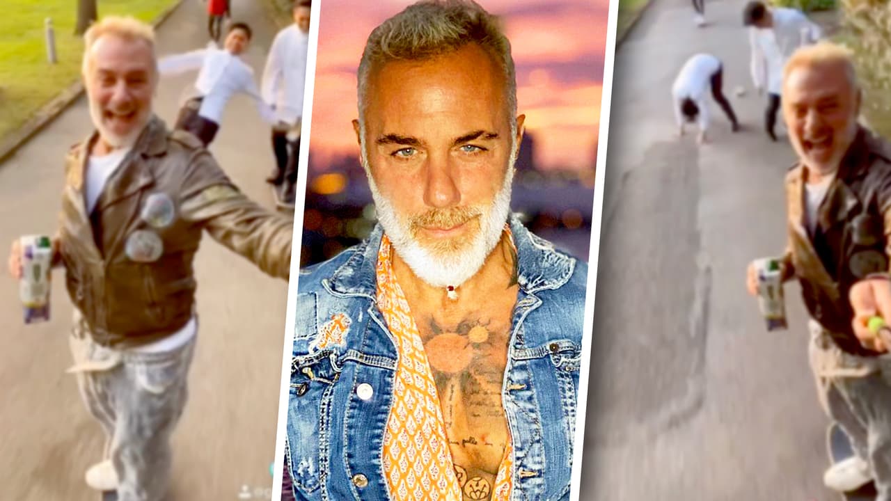 Gianluca Vacchi quiso mostrar su habilidad en la patineta junto a su equipo, pero a uno de ellos no le fue tan bien