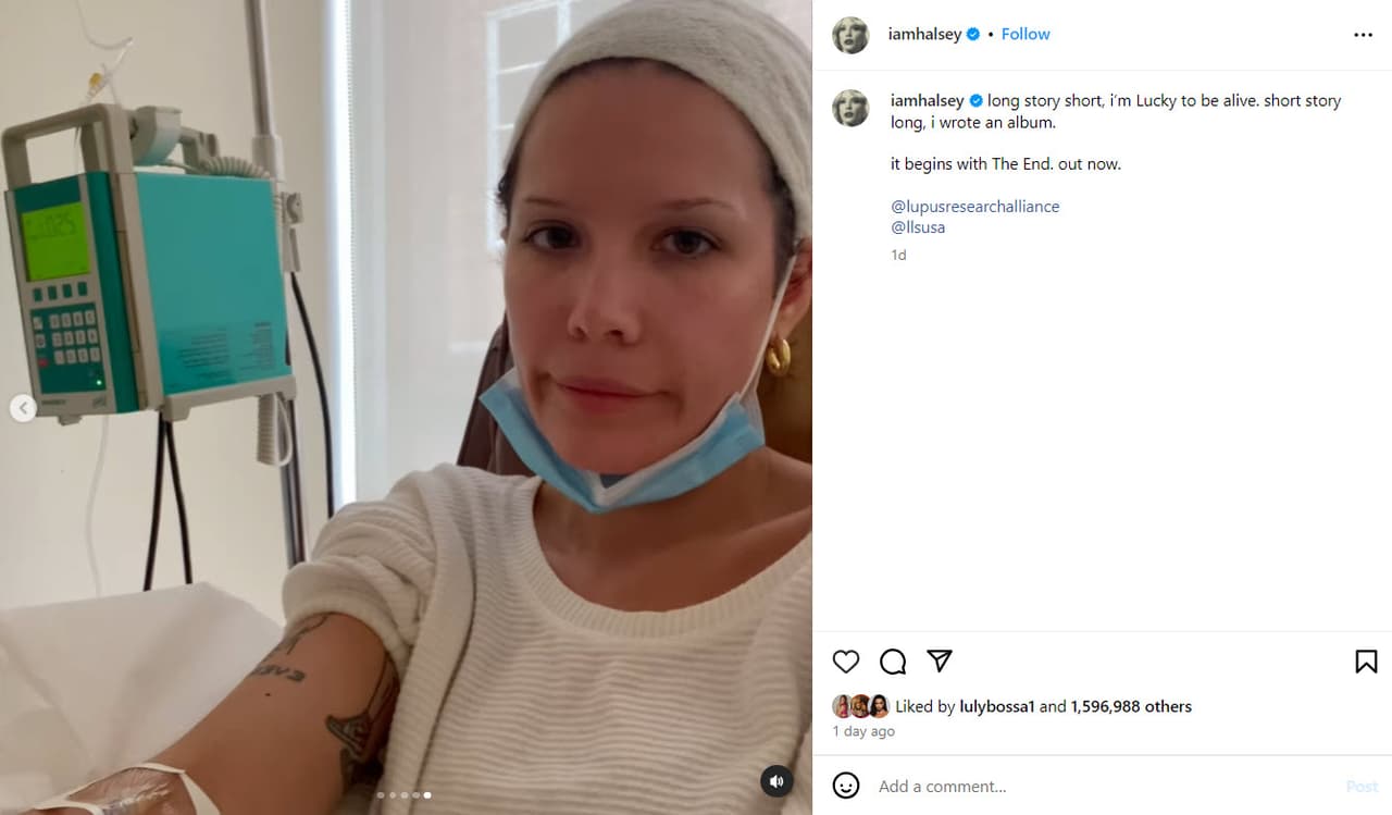 En dicha publicación, en la que etiquetó a la Lupus Research Alliance y a la Leukemia & Lymphoma Society, Halsey compartió una serie de imágenes y videos donde muestra parte del proceso por el que ha atravesado.