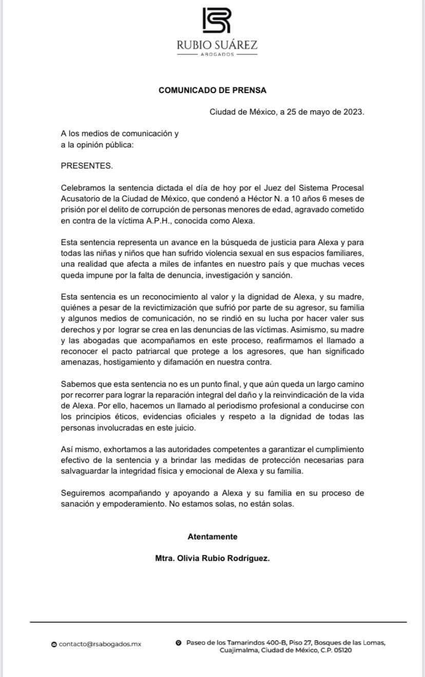 Según el documento difundido por la abogada Rubio, "el Juez del Sistema Procesal Acusatorio de la Ciudad de México, condenó a Héctor N a 10 años 6 meses de prisión por el delito de corrupción de menores de edad, agravado cometido en contra de la víctima A.P.H., conocida como Alexa".