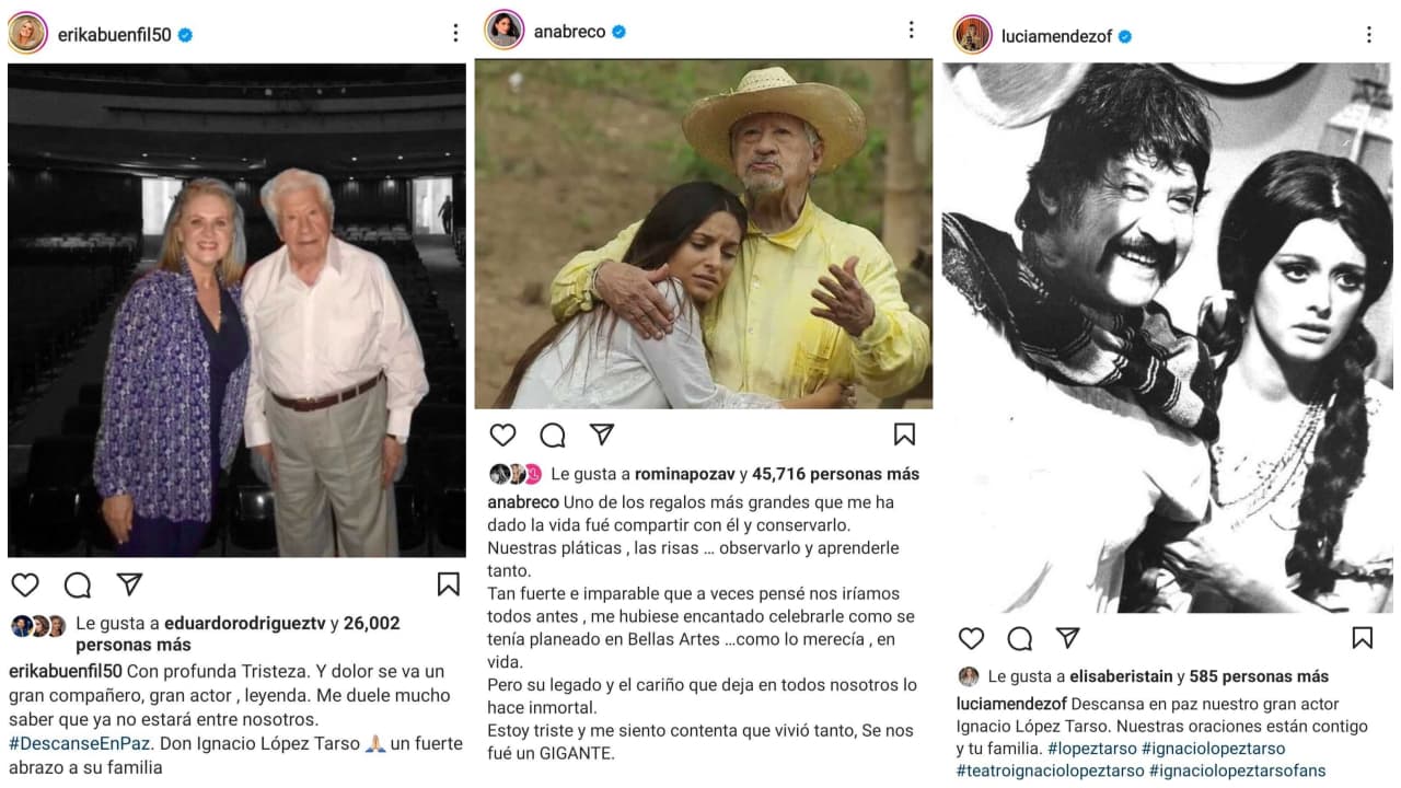 Andrea Legarreta externó su pesar: "¡Adorado y dulce caballero! ¡El más grande y talentoso! Siempre atento… Siempre cercano… Tan grande y tan sencillo… Cálido, bromista, cercano… ¡Memoria impecable! Siempre que me preguntaba por mi familia, mencionaba los nombres de cada uno… Y sus pláticas y anécdotas tan maravillosas como el hermoso ser que era. Me duele mucho su partida… Ya habíamos quedado de celebrar sus 100 años de maravillosa vida, aplaudiéndole en primera fila de esa obra que pondría… ¡El cielo está de fiesta señor precioso! Celebro su grandeza como actor y ser humano. Gracias siempre por su calidez. Lo vamos a extrañar. Nos deja un gran legado. Vuele muy alto don Ignacio López Tarso. Bendiciones y mi pésame a su familia. Juan Ignacio Aranda te abrazo con mucho amor".