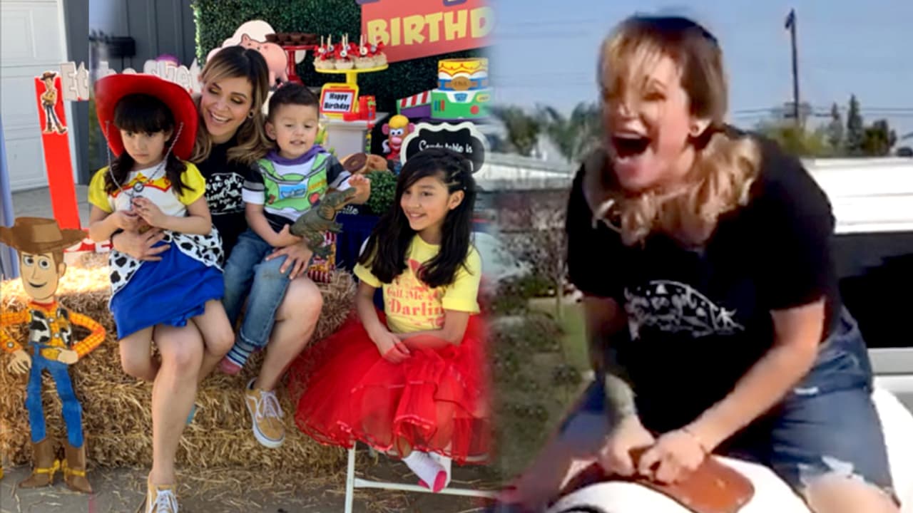 Jordan, el hijo de Jacqie Rivera, cumplió 5 años y su mamá lo festejó con una fiesta temática de 'Toy Story', con paquetes de paja, inflables y decoración de la película animada. La hija de Jenni Rivera, acostumbrada a practicar fuertes rutinas de ejercicio con las que ha logrado bajar de peso, se armó de valor y subió al toro mecánico.