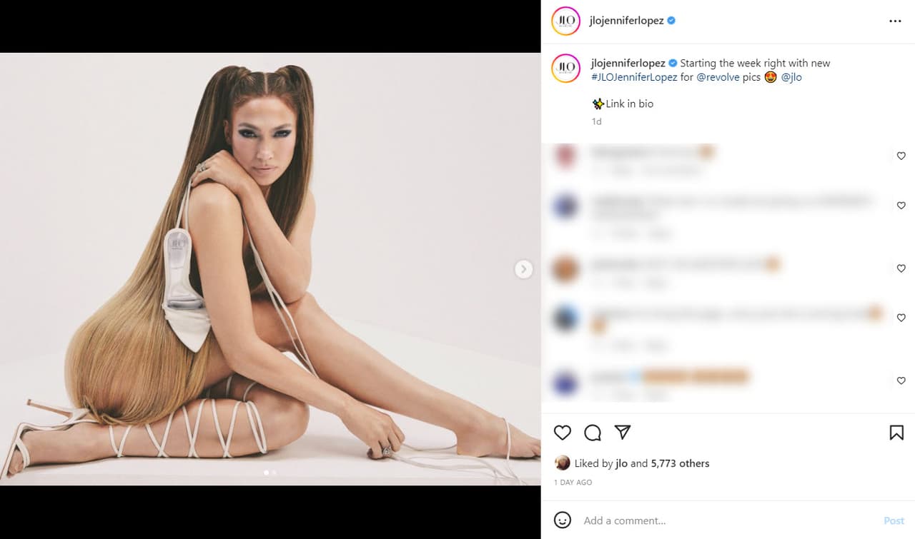"Empezando bien la semana con la nueva #JLOJenniferLopez para las fotos de Revolve", se lee al pie del post en la cuenta de su marca de moda.