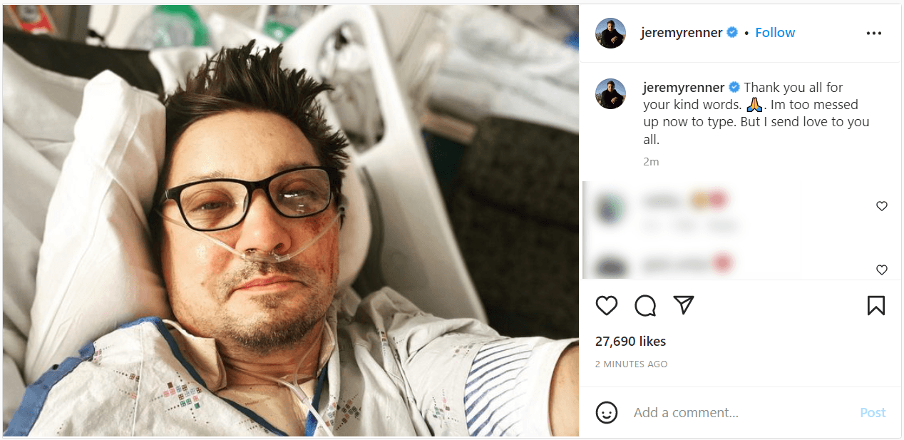 De acuerdo con su publirrelacionista, Renner "está progresando positivamente y está despierto, hablando y de buen humor. Permanece en la UCI en estado crítico pero estable. Está abrumado por las muestras de amor y apoyo. La familia pide sus pensamientos continuos mientras sana con sus seres queridos más cercanos", declaró a TMZ.