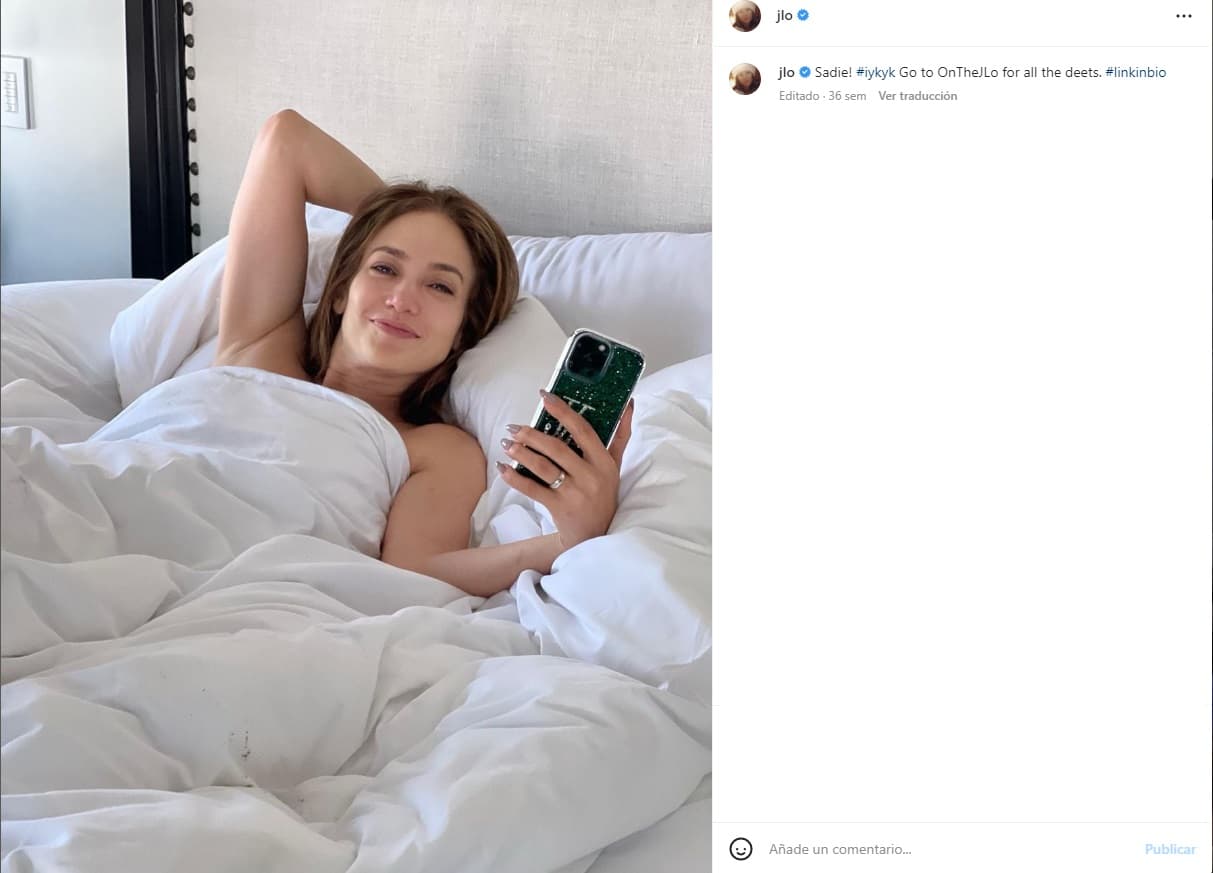 Otra de las fotos en las que JLo aparece no solo sin maquillaje sino recién levantada, es la que publicó en julio del año pasado, días después de su boda en Las Vegas con Ben Affleck. Además de su sonrisa y su rostro radiante, en esa imagen ganó protagonismo su sortija de casada.