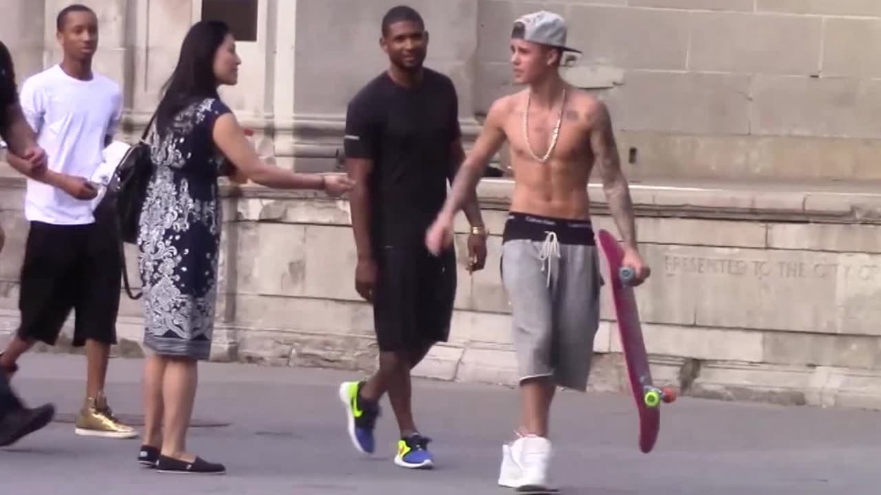 Justin Bieber lleva su monopatín a las calles de Nueva York, pero olvida su camiseta.
