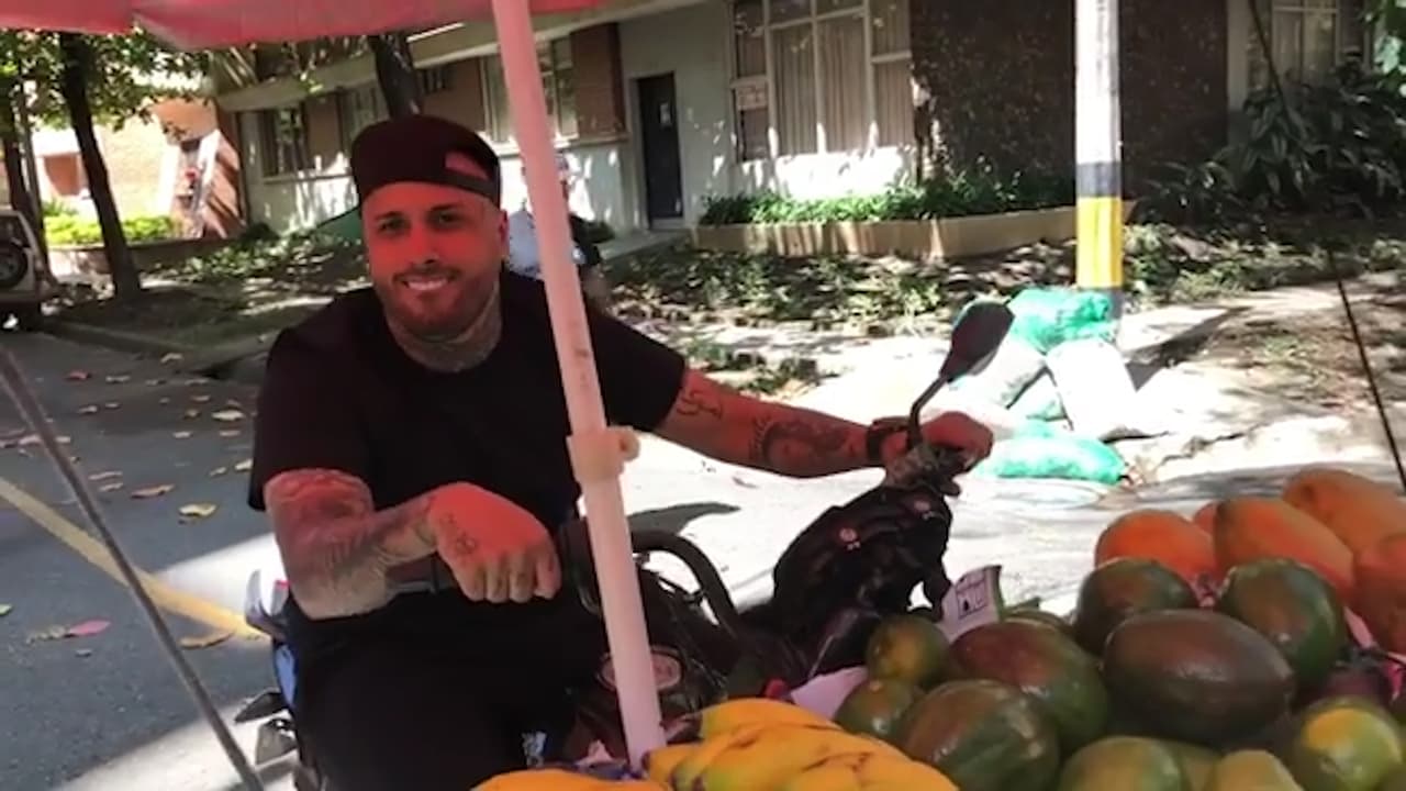 El reggaetonero, que está en Colombia para disfrutar de la Navidad, aprovechó un día soleado para pasear en una motocicleta de carga y de paso vender unos cuantos aguacates, papayas y algo más.