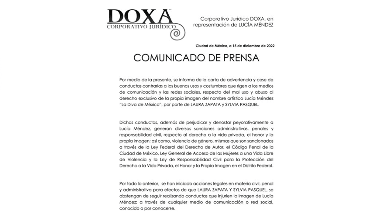 "Por medio de la presente, se informa de la carta de advertencia y cese de conductas contrarías a los buenos usos y costumbres que rigen a los medios de comunicación y las redes sociales, respecto del mal uso y abuso al derecho exclusivo de la propia imagen del nombre artístico Lucía Méndez 'La Diva de México', por parte de Laura Zapata y Sylvia Pasquel", se lee en el primer párrafo.