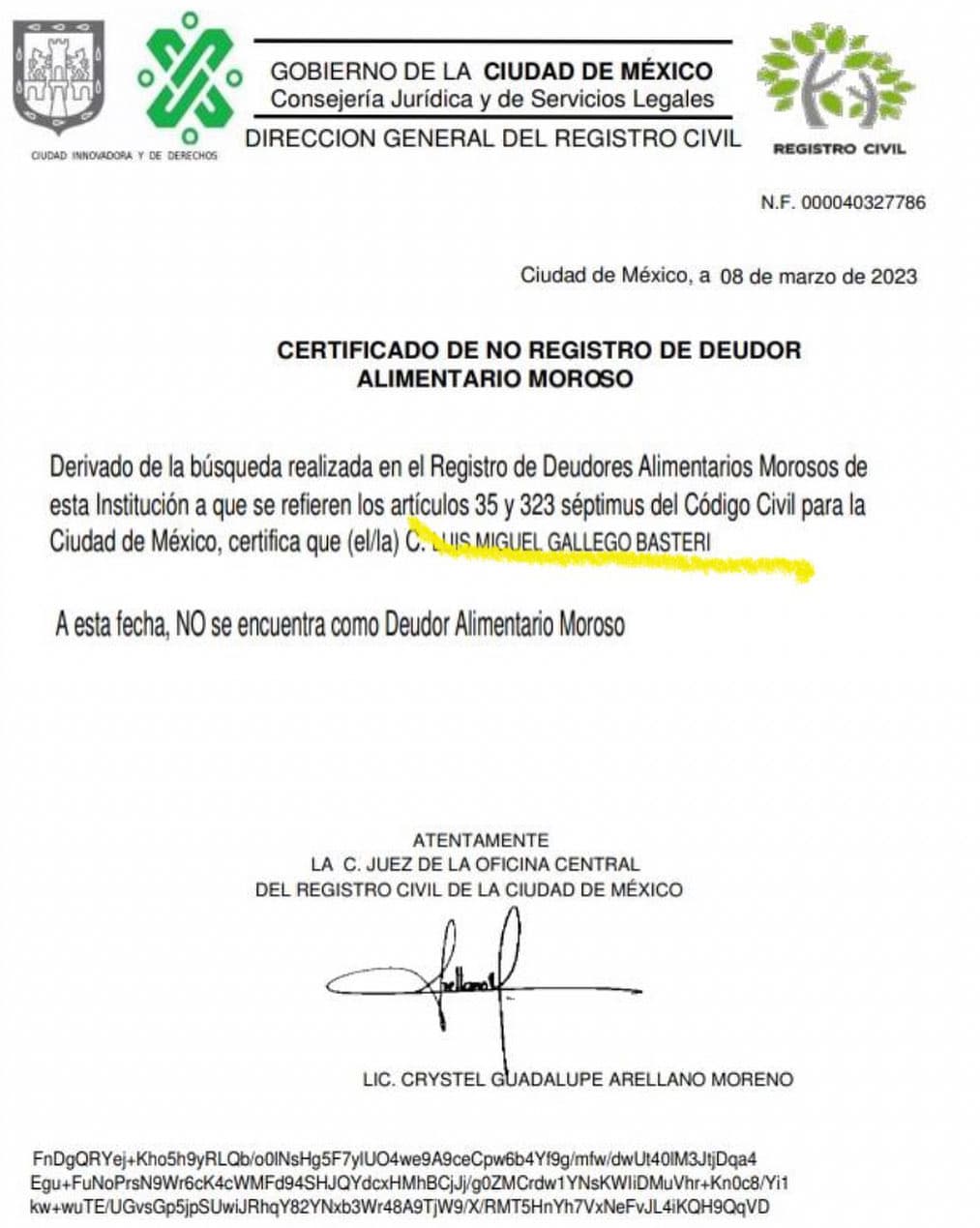 "Derivado de la búsqueda realizada en el registro de deudores alimentarios morosos de esta institución que se refieren los artículos 35 y 323 séptimos del código civil para la Ciudad de México, certifica que Luis Miguel Gallego Basteri a esta fecha no se encuentra como deudor alimentario moroso", se lee en el documento oficial.