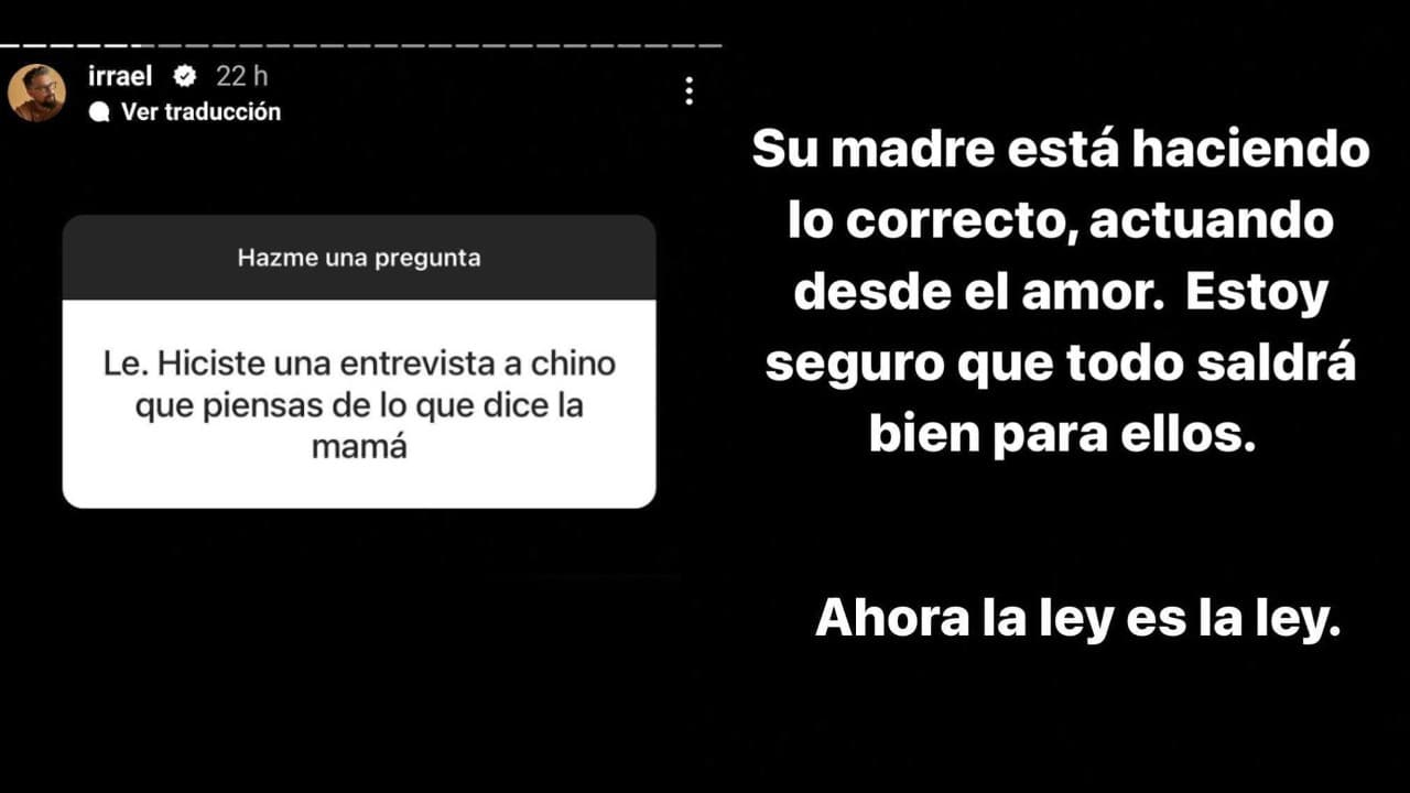 "¿Le hiciste una entrevista a Chyno, ¿qué piensa de lo que dice la mamá?", es el cuestionamiento del usuario. " Su madre está haciendo lo correcto, actuando desde el amor. Estoy seguro que todo saldrá bien para ellos. Ahora la ley es la ley", respondió Irrael.