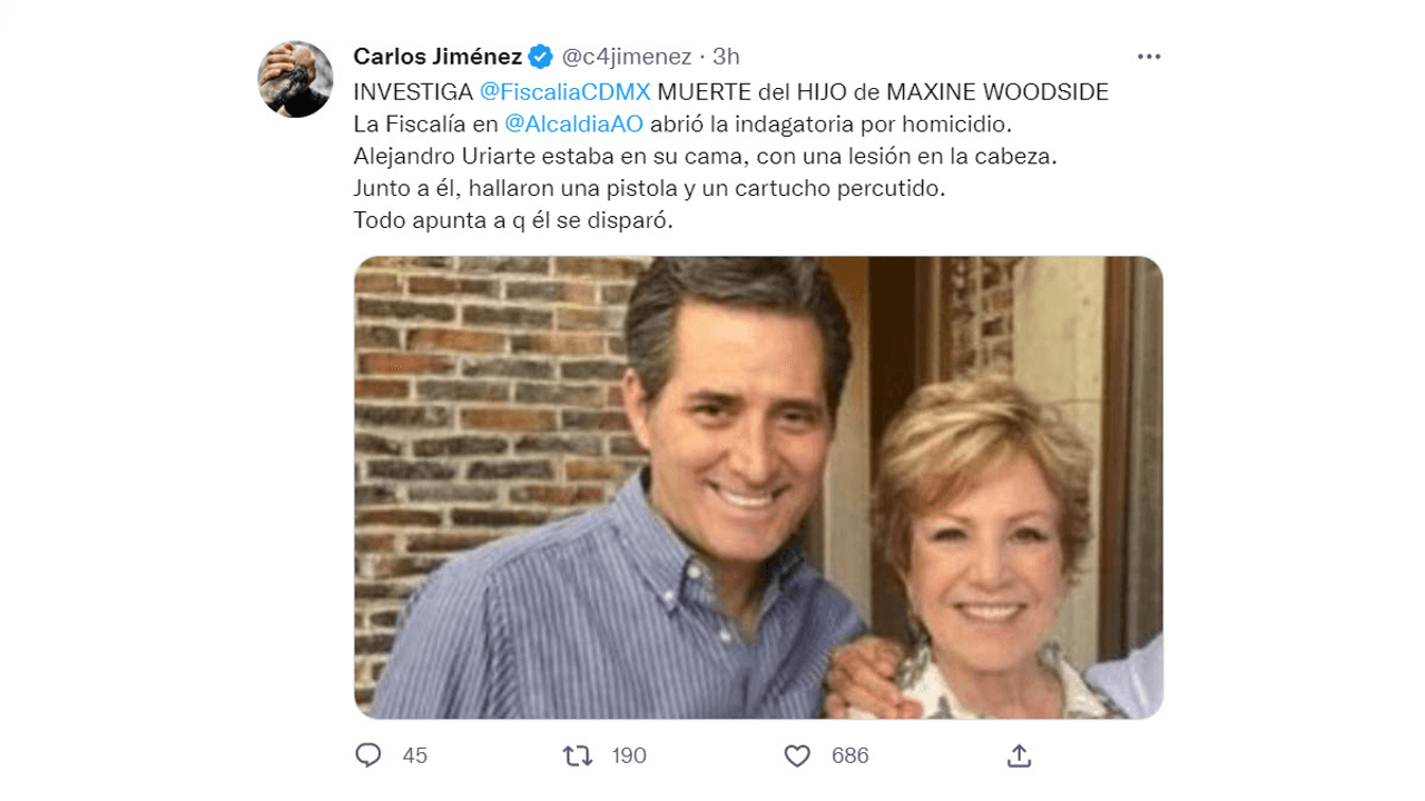 "Investiga Fiscalía General de Justicia de la Ciudad de México muerte del hijo de Maxine Woodside. La Fiscalía en Álvaro Obregón abrió la indagatoria por homicidio. Alejandro Iriarte estaba en su cama, con una lesión en la cabeza. Junto a él, hallaron una pistola y un cartucho percutido. Todo apunta a que él se disparó".