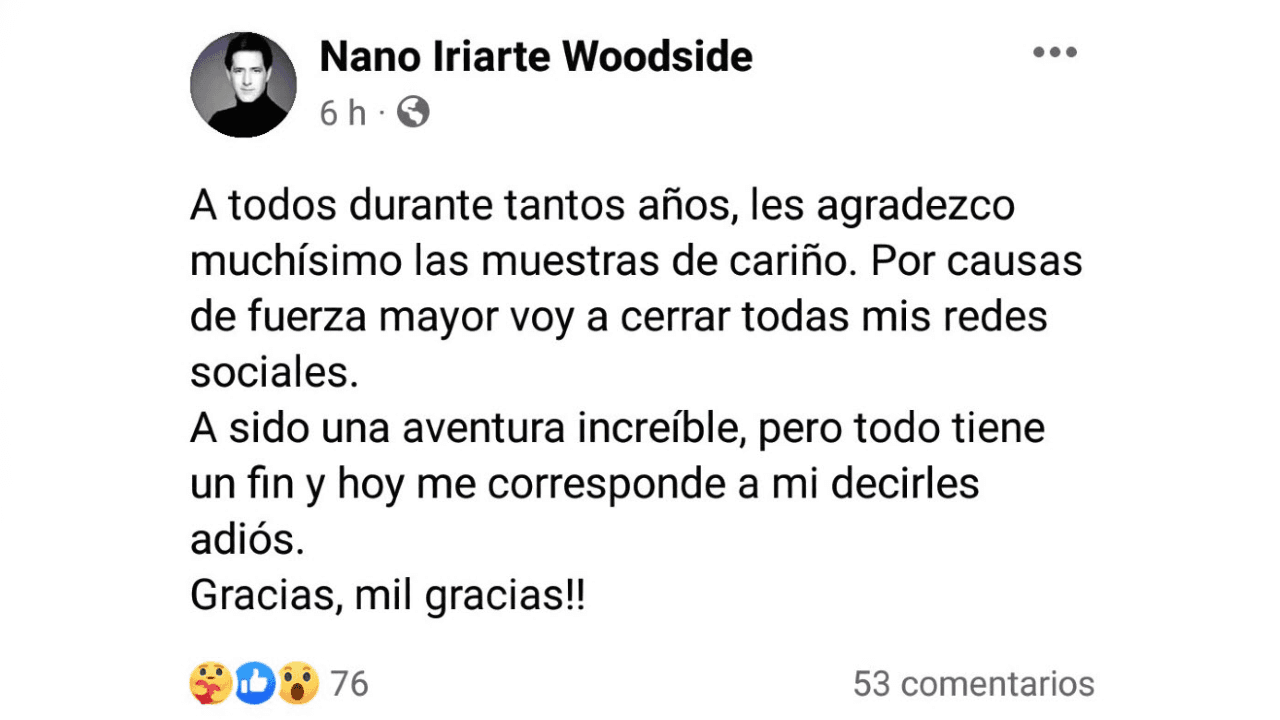 Al mediodía del 10 de noviembre, Alejandro Iriarte Woodside anunció que cerraría sus cuentas en las redes sociales por "causas de fuerza mayor" y agradeció el cariño que le brindaron durante tantos años.