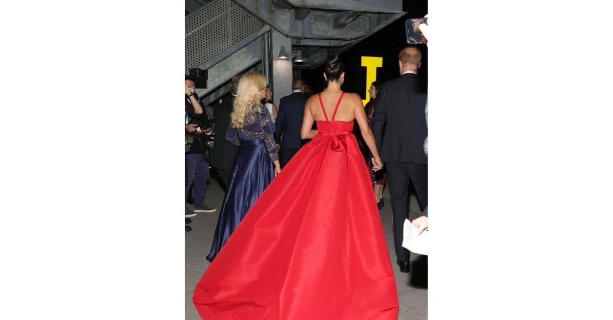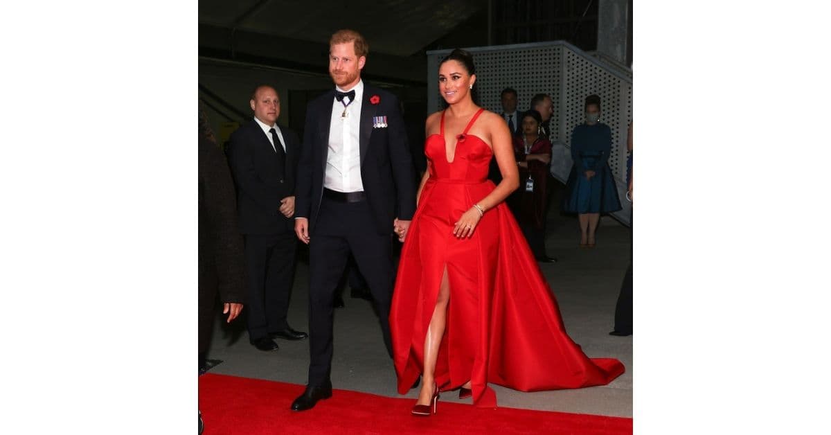 Para ese evento, Markle deslumbró con un vestido rojo con un escote pronunciado y la espalda al descubierto. Complementó el look con unos zapatos de satén burdeos de Giuseppe Zanottisu, el cabello recogido en un moño de nudo y un maquillaje que incluyó ‘smokey eye’. Por su parte, Harry optó por un elegante esmoquin negro.