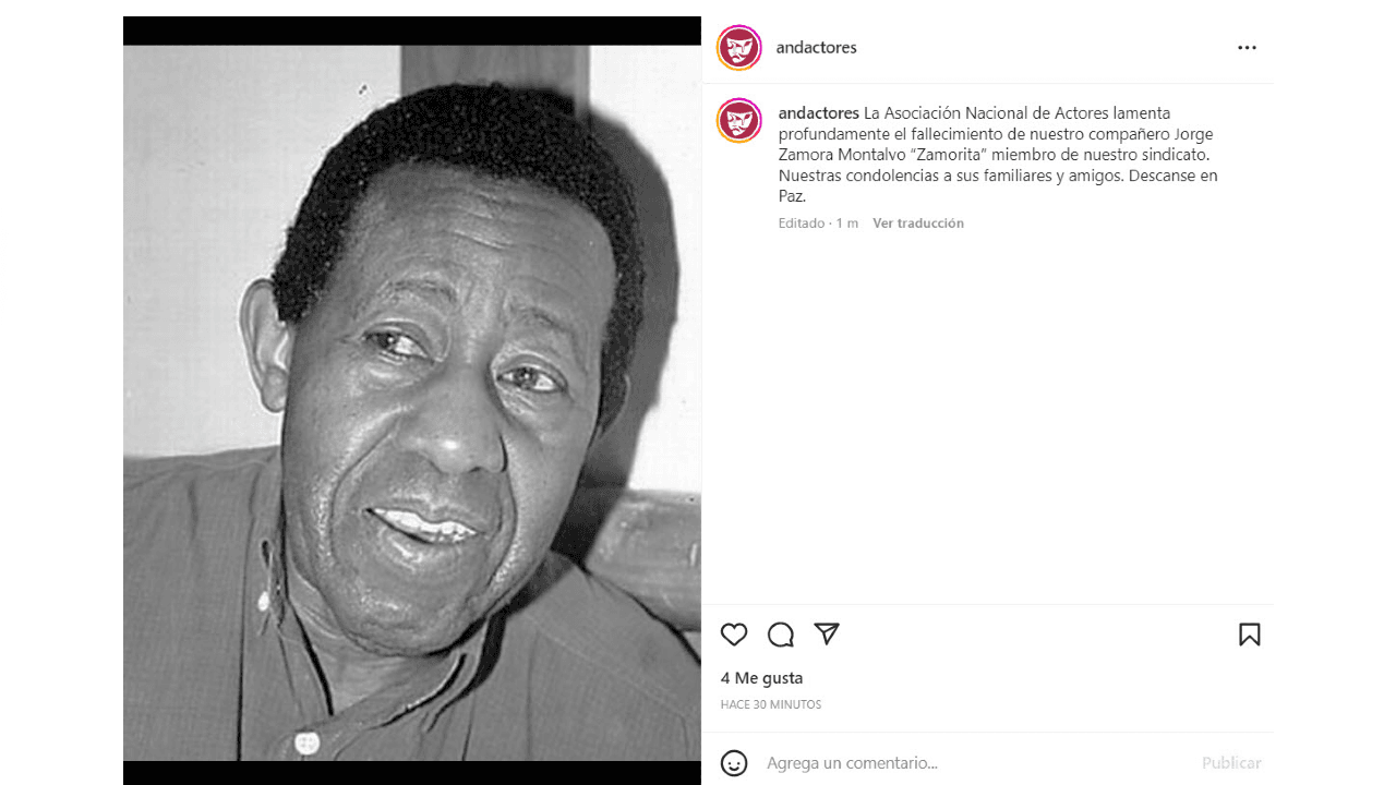 "La Asociación Nacional de Actores lamenta profundamente el fallecimiento de nuestro compañero Jorge Zamora Montalvo 'Zamorita' miembro de nuestro sindicato. Nuestras condolencias a sus familiares y amigos. Descanse en Paz".