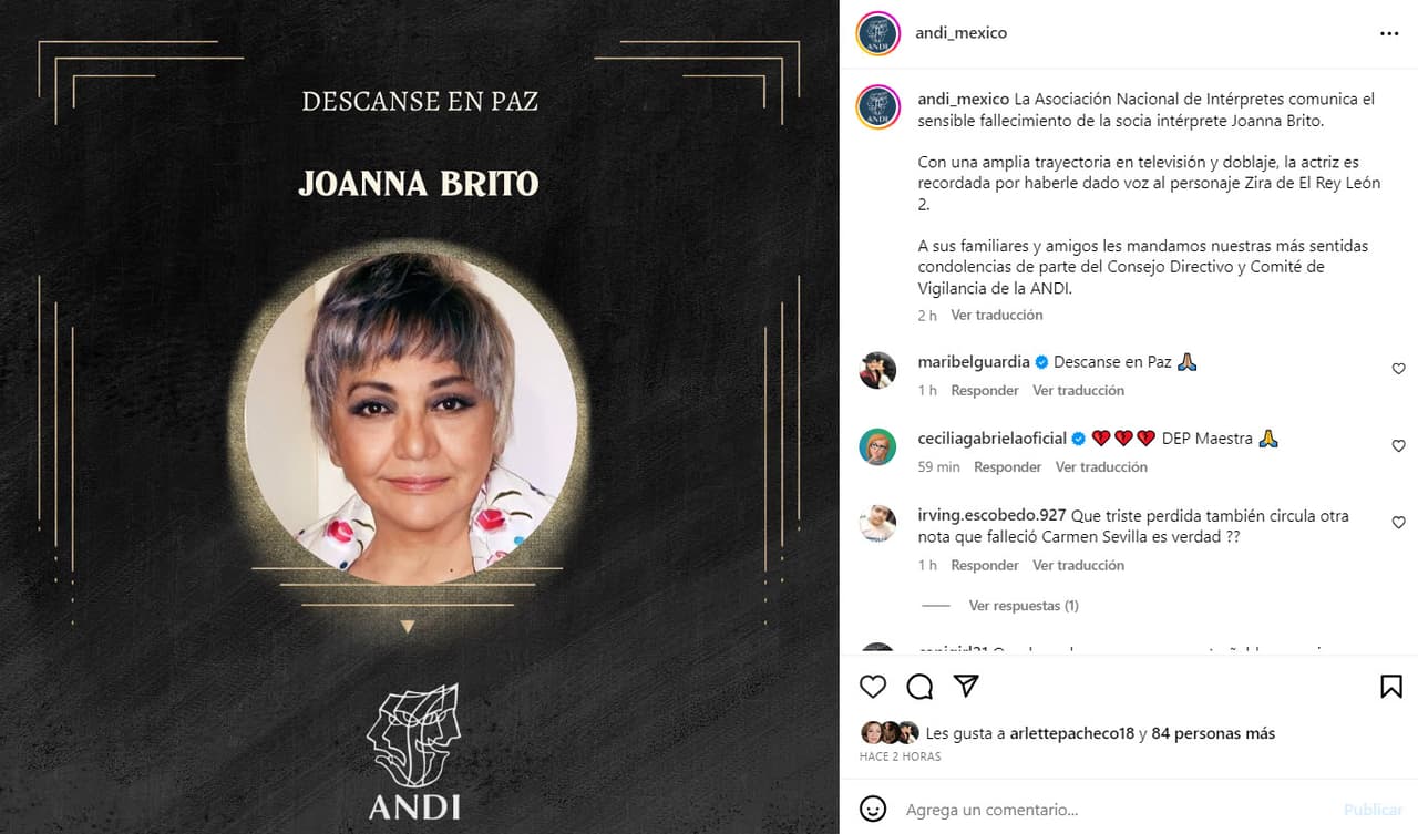 "La Asociación Nacional de Intérpretes comunica el sensible fallecimiento de la socia intérprete Joanna Brito. Con una amplia trayectoria en televisión y doblaje, la actriz es recordada por haberle dado voz al personaje Zira de 'El Rey León 2'. A sus familiares y amigos les mandamos nuestras más sentidas condolencias de parte del Consejo Directivo y Comité de Vigilancia de la ANDI", se lee.