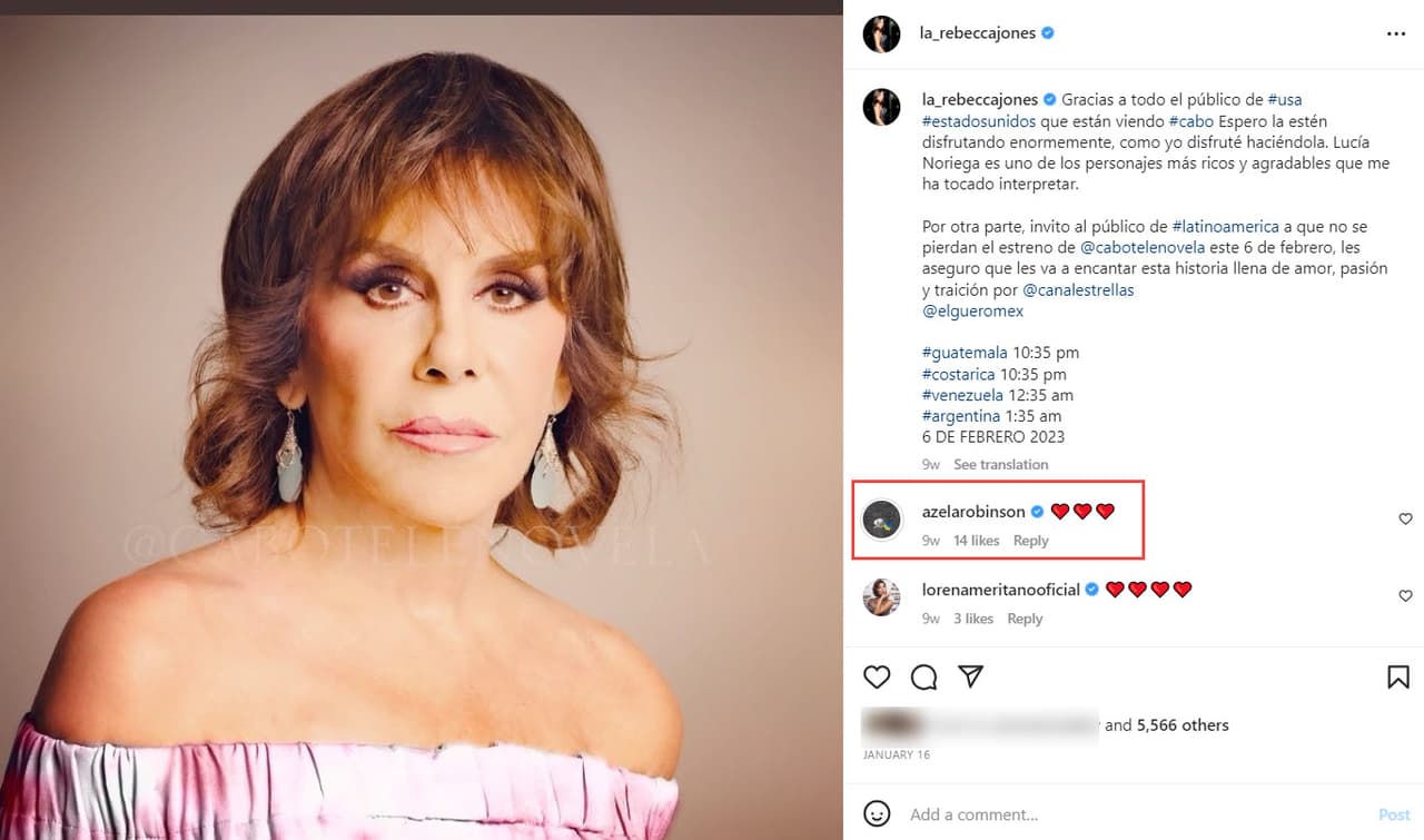 "Gracias a todo el público de Estados Unidos que están viendo Cabo, espero la estén disfrutando enormemente, como yo disfruté haciéndola. Lucía Noriega es uno de los personajes más ricos y agradables que me ha tocado interpretar", compartió en Instagram. Azela Robinson reaccionó a la publicación con corazones rojos.