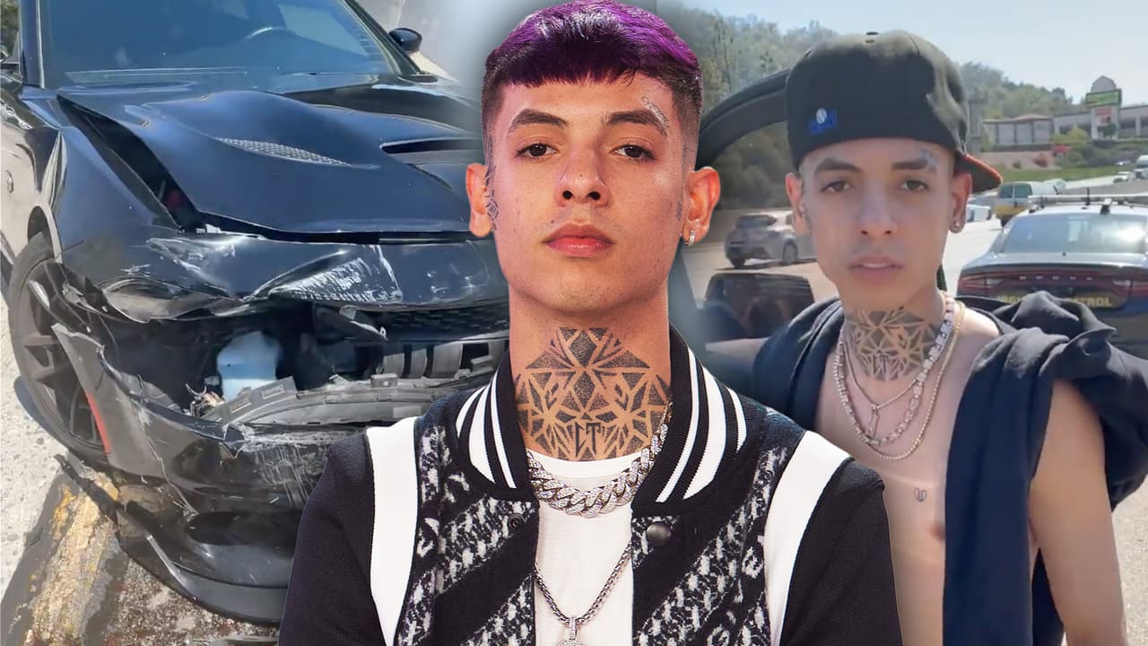 La tarde de este martes 6 de julio, el cantante de corridos tumbados reaccionó cuando se dio cuenta que lo estaban grabando, luego de que ocurriera un accidente automovilístico. Aunque no aclaró si él viajaba en el auto, mostró los daños.