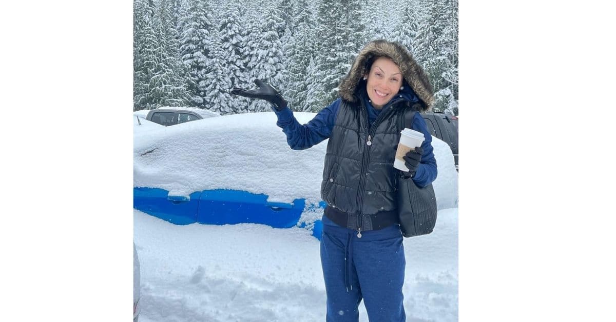 Rodeada de pinos, con un café en la mano y usando un pants color azul que combinó con un chaleco negro con peluche, la actriz presumió su rostro al natural a sus 45 años.