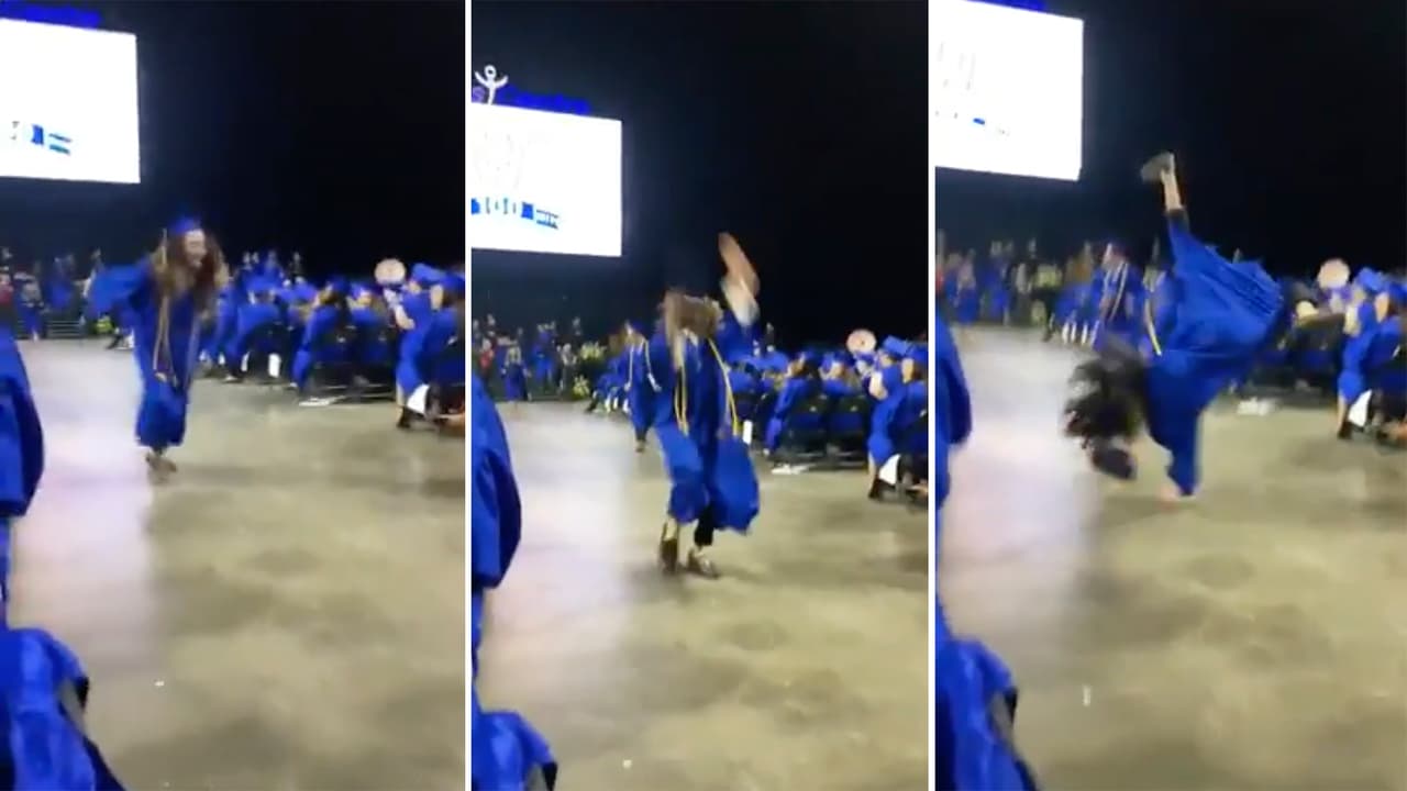 Este joven jamás olvidará su ceremonia de grado, y no precisamente por haber terminado sus estudios en la escuela secundaria de Warren Township, Illinois. Tal parece que se emocionó más de la cuenta e intentó hacer un backflip, con tan mala suerte que terminó en el suelo.
