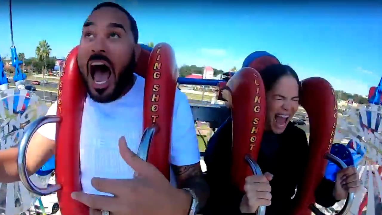 Raphy Pina y Natti Natasha se subieron a la atracción mecánica Slingshot’, que alcanza una velocidad superior a las 60 millas por hora. El productor musical parecía muy confiado al principio y trataba de tranquilizar a su pareja, pero la realidad fue otra cuando salieron a volar.