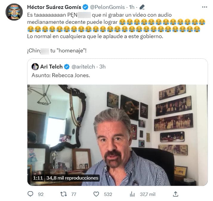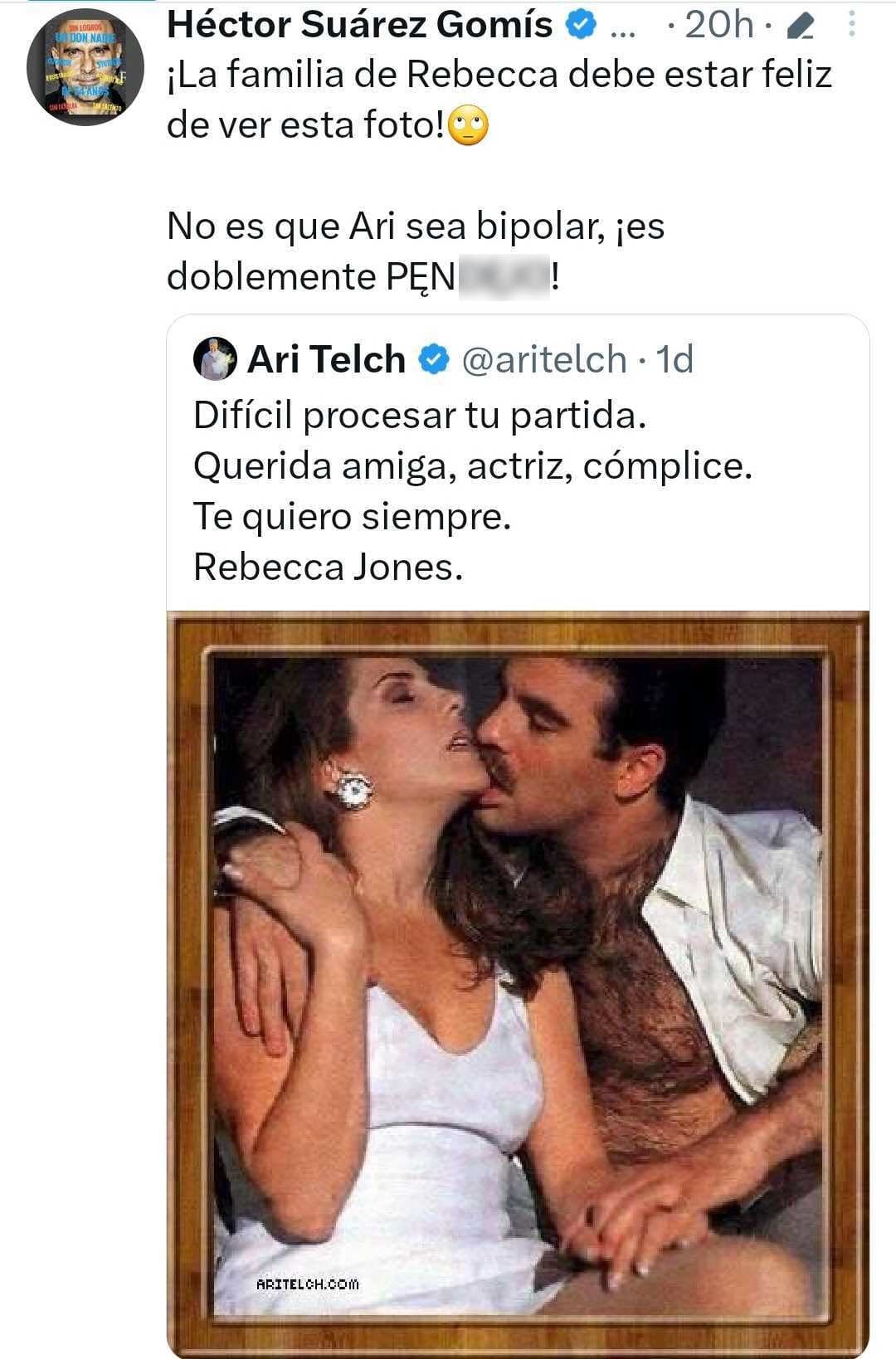 Entre los inconformes se encuentra el histrión Héctor Suárez Gomís, quien publicó en la mencionada red social: "¡La familia de Rebecca debe estar feliz de ver esta foto! No es que Ari sea bipolar, ¡es doblemente pen…!".