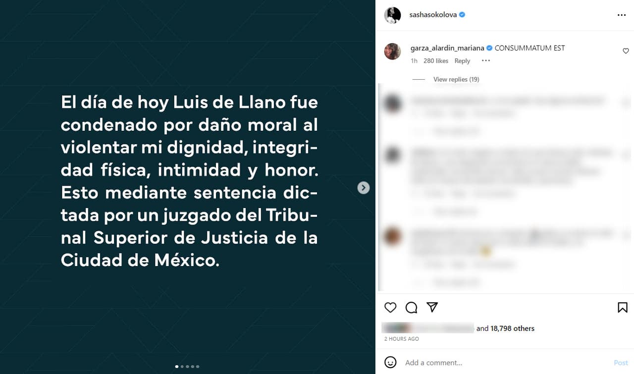 Un año después de que denunciara públicamente el abuso que sufrió por parte de Luis de Llano, con quien sostuvo una relación cuando era menor de edad, Sasha Sökol informó que el productor fue condenado por "daño moral".