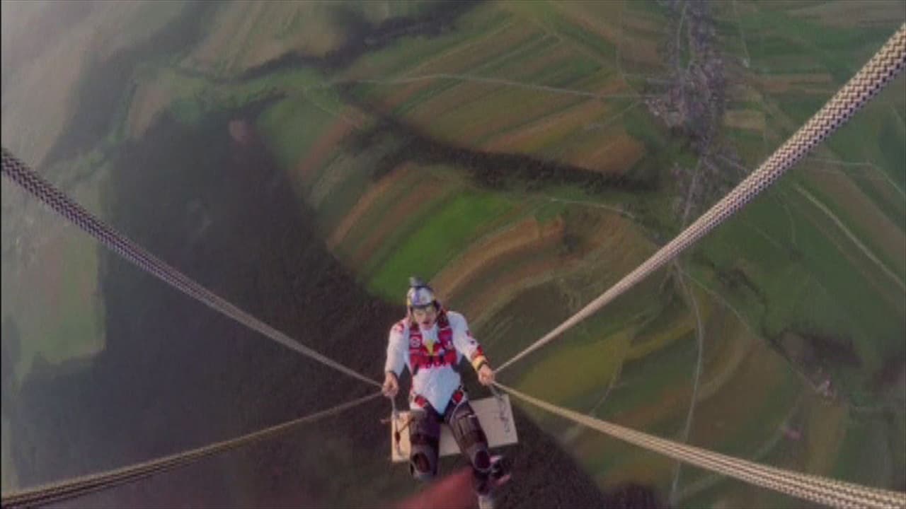 Se columpian desde dos globos aerostáticos para romper un récord mundial