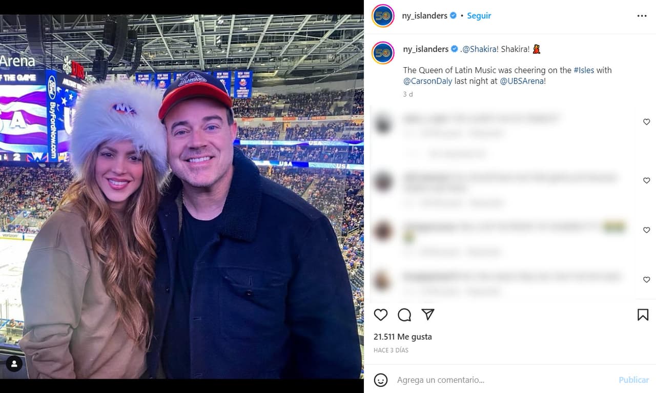 La fotografía, que tiene a medio mundo intentado saber si Shakira estaría en un nuevo romance, fue difundida en Instagram el 12 de marzo por la cuenta oficial del equipo Islanders: "¡La Reina de la Música Latina estaba animando a las Islas con Carson Daly anoche en la Arena UBS!".