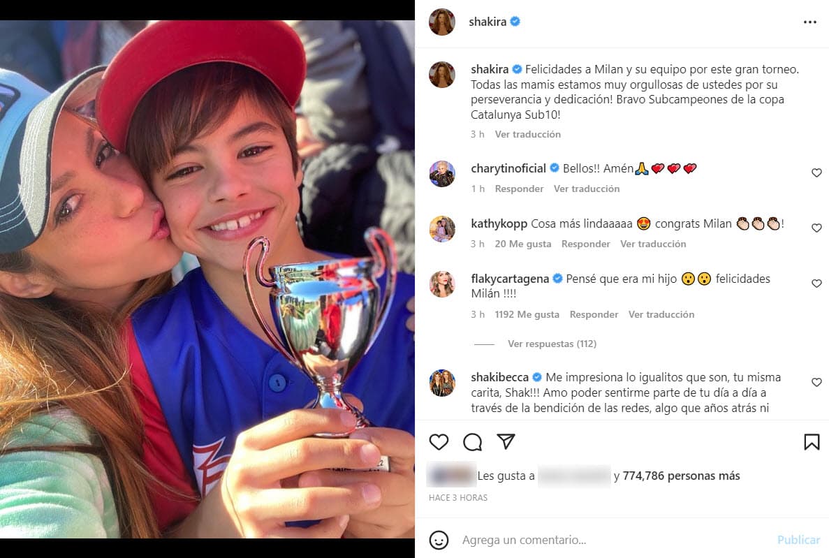 Acompañada de una fotografía de la cantante y su hijo escribió el siguiente mensaje: "Felicidades a Milan y su equipo por este gran torneo. Todas las mamis estamos muy orgullosas de ustedes por su perseverancia y dedicación. ¡Bravo Subcampeones de la copa Catalunya Sub10!". Por su parte, Gerard Piqué no compartió ninguna publicación en su perfil al respecto.