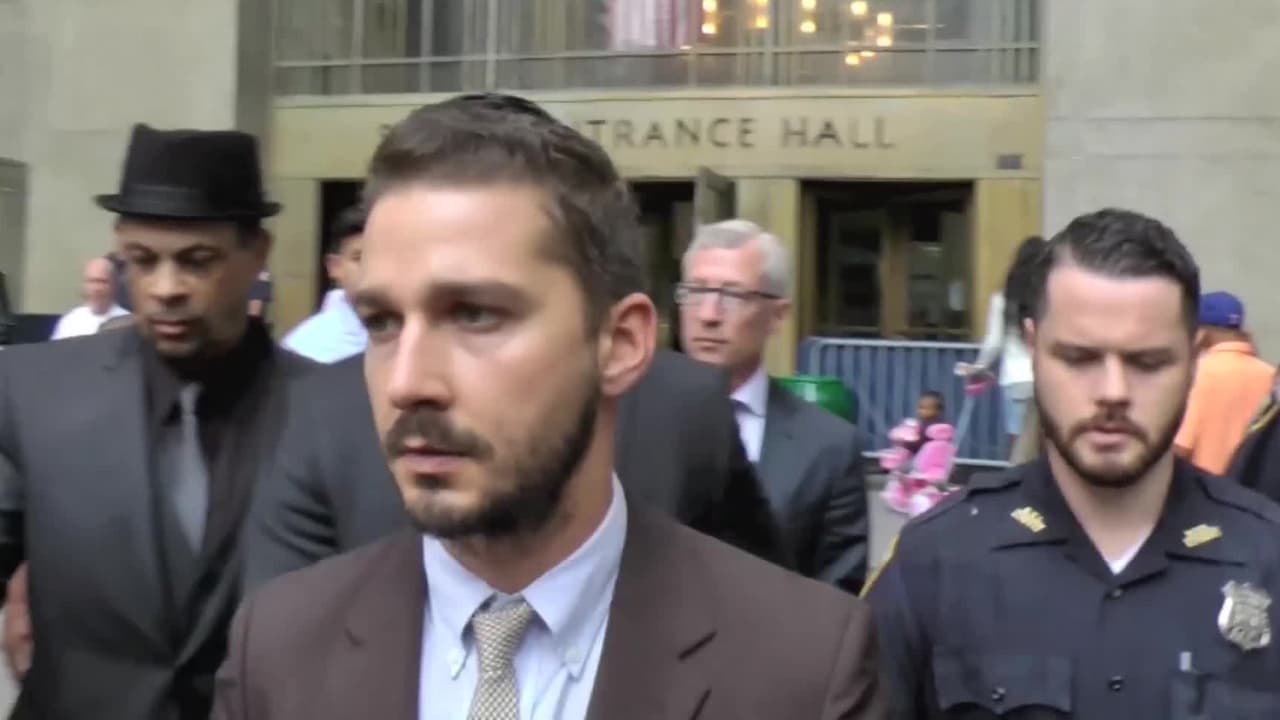 Shia LaBeouf sale de la corte en Nueva York y es rodeado de reporteros preguntándole sobre lo que pasó en la corte. Vean cómo reacciona. Shia