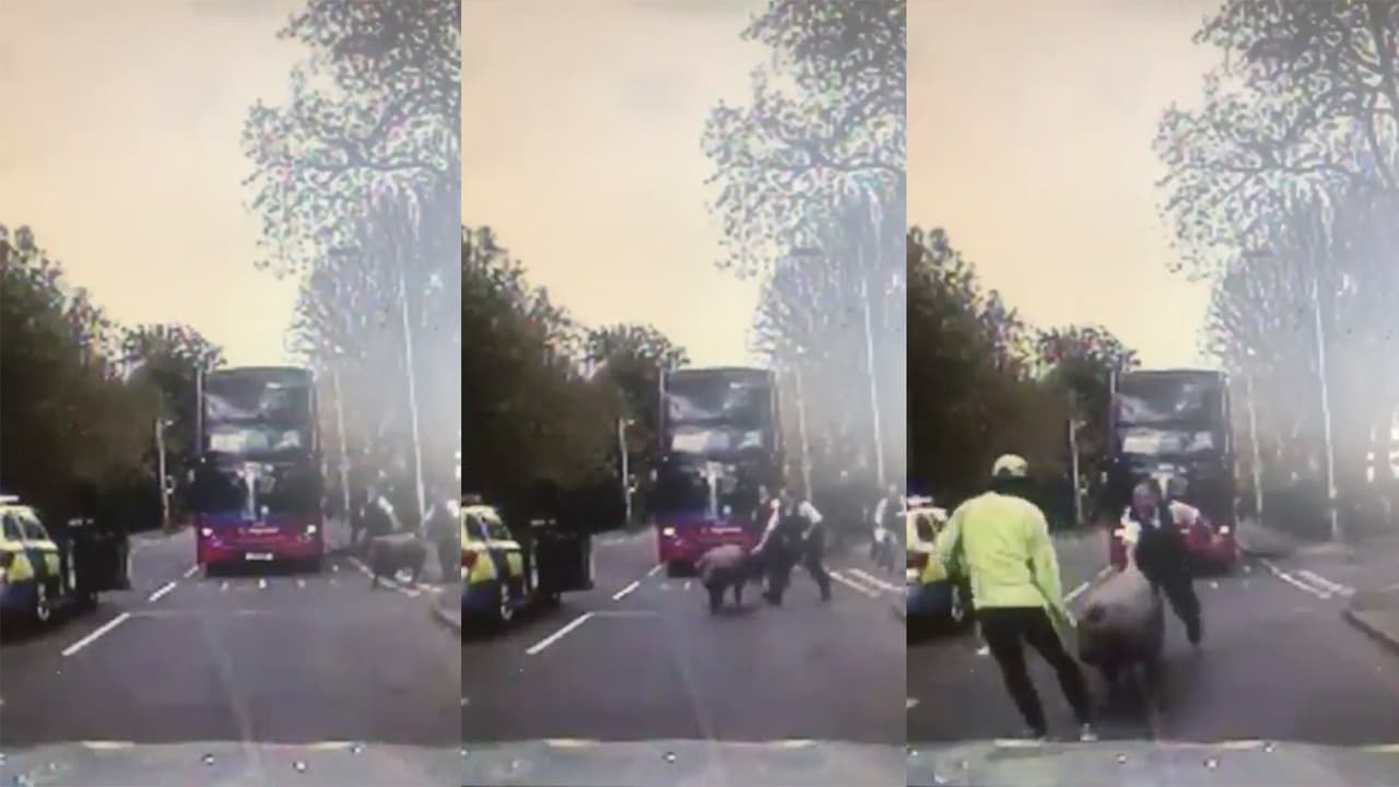 Al mejor estilo de Benny Hill, la policía de la carretera en Redbridge, Londres, protagonizó una divertida persecución a un cerdo corría suelto por las calles.
