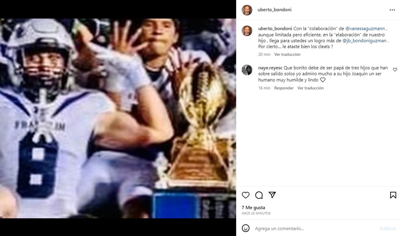 El actor y escritor uruguayo, Uberto Bondoni, de 47 años, utilizó una fotografía de la victoria de su hijo para presumirlo, pero también arrobó a su expareja, la mexicana Vanessa Guzmán.