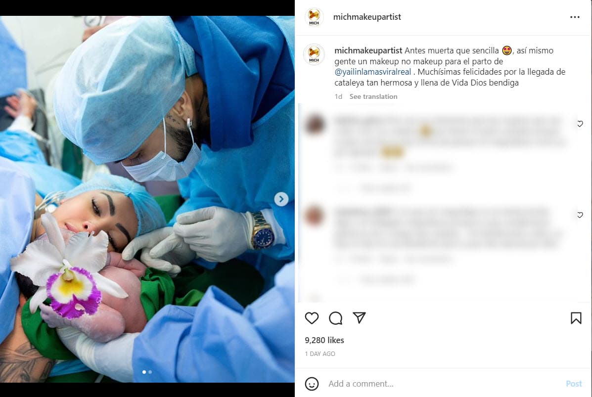 Sin embargo, fue la maquillista Mich MakeUp quien confirmó que arregló a la cantante para que diera a luz al publicar las imágenes de Yailin La Más Viral en su perfil de Instagram, a las que agregó el siguiente texto: " Primero muerta que sencilla. Sí gente, le hice un makeup no makeup para el parto, nunca destruida mi amor. Nuevo servicio habilitado, maquillaje para dar a luz. ¡Claro que yes!", finalizó en su mensaje la maquilladora.