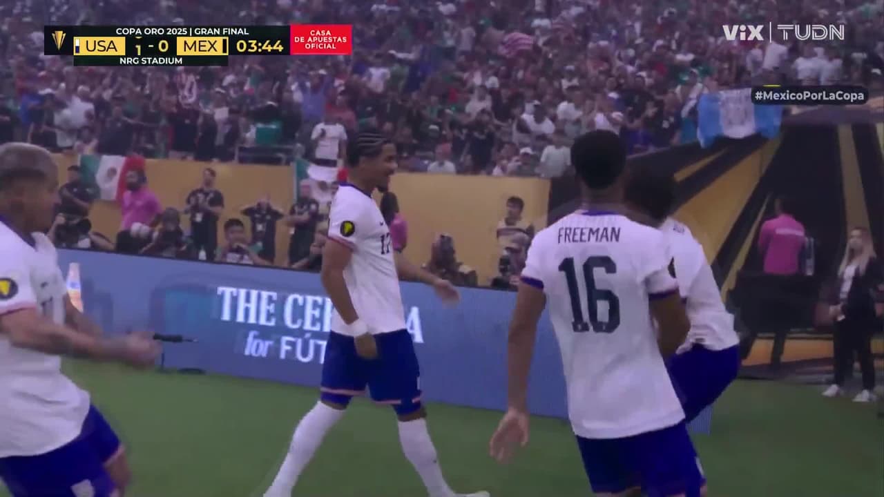 Chris Richards mete el cabezazo en el área, el balón pega en el travesaño y pica adentro de la portería para el 1-0 en favor de Estados Unidos.