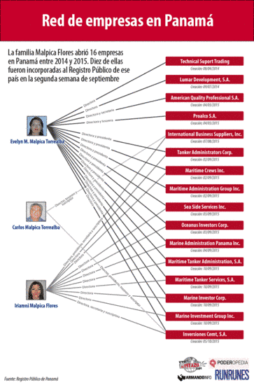Su entorno ha tomado nota de esta situación y comienza a sacar provecho. Nueve meses después de instalarse en la directiva de Pdvsa, el administrador coincidió en Panamá con sus padres, Carlos Malpica Torrealba y Eloísa Flores. En ese mismo período y en esa ciudad se registraron 10 empresas familiares, del 2 al 10 de septiembre.
