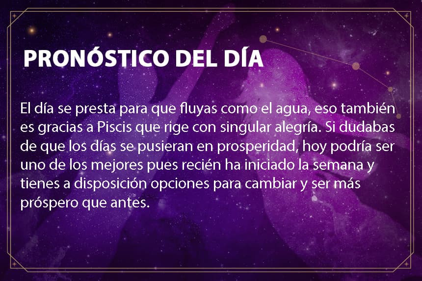 Horóscopo DiarioGracias a la energía de Pisics hoy podría ser uno de los mejores pues recién ha iniciado la semana y tienes a disposición opciones para cambiar y ser más próspero que antes.