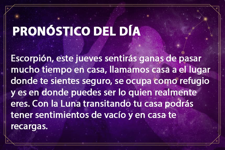 Horóscopo DiarioEscorpión, con la luna transitando en tu casa este día es ideal para pasarla en casa donde te sentirás seguro y querido.