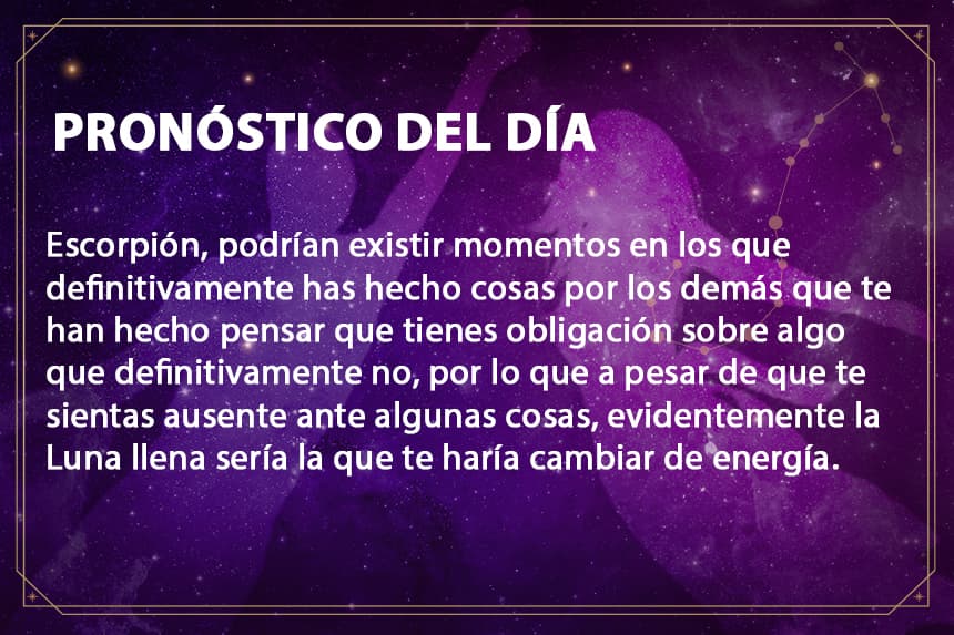 Horóscopo DiarioEscorpión, la energía de la Luna llena te ayuda a frenar con responsabilidades adquiridas que no te corresponden.