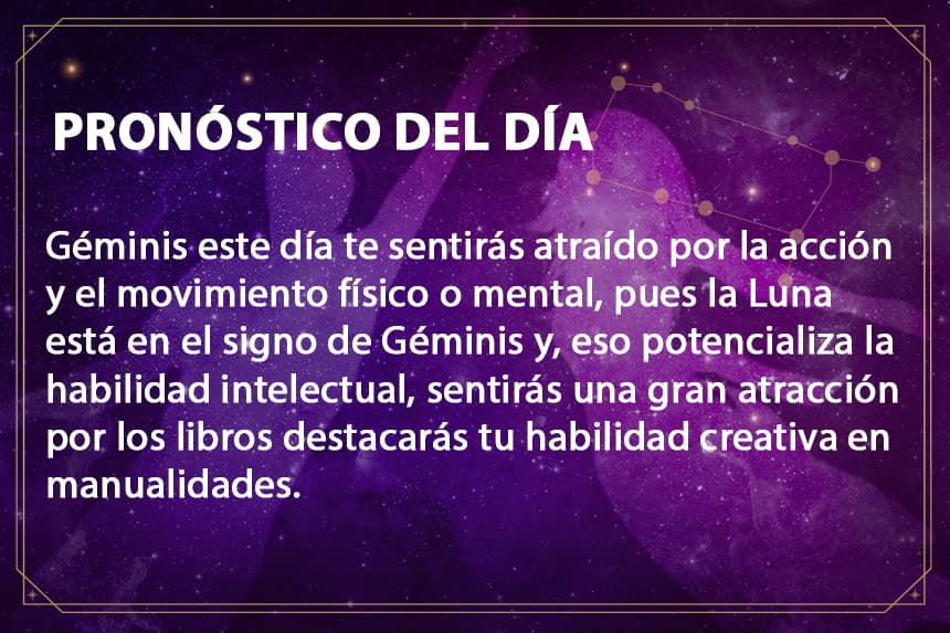 GéminisGéminis, la Luna está en Géminis y esto hace que incremente tu habilidad de movimiento e intelectual.