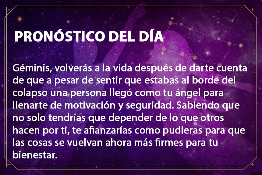 Horóscopo DiarioGéminis una persona llega a tu vida como una guía y te explica las cosas de una manera clara, lo que te llena de seguridad.