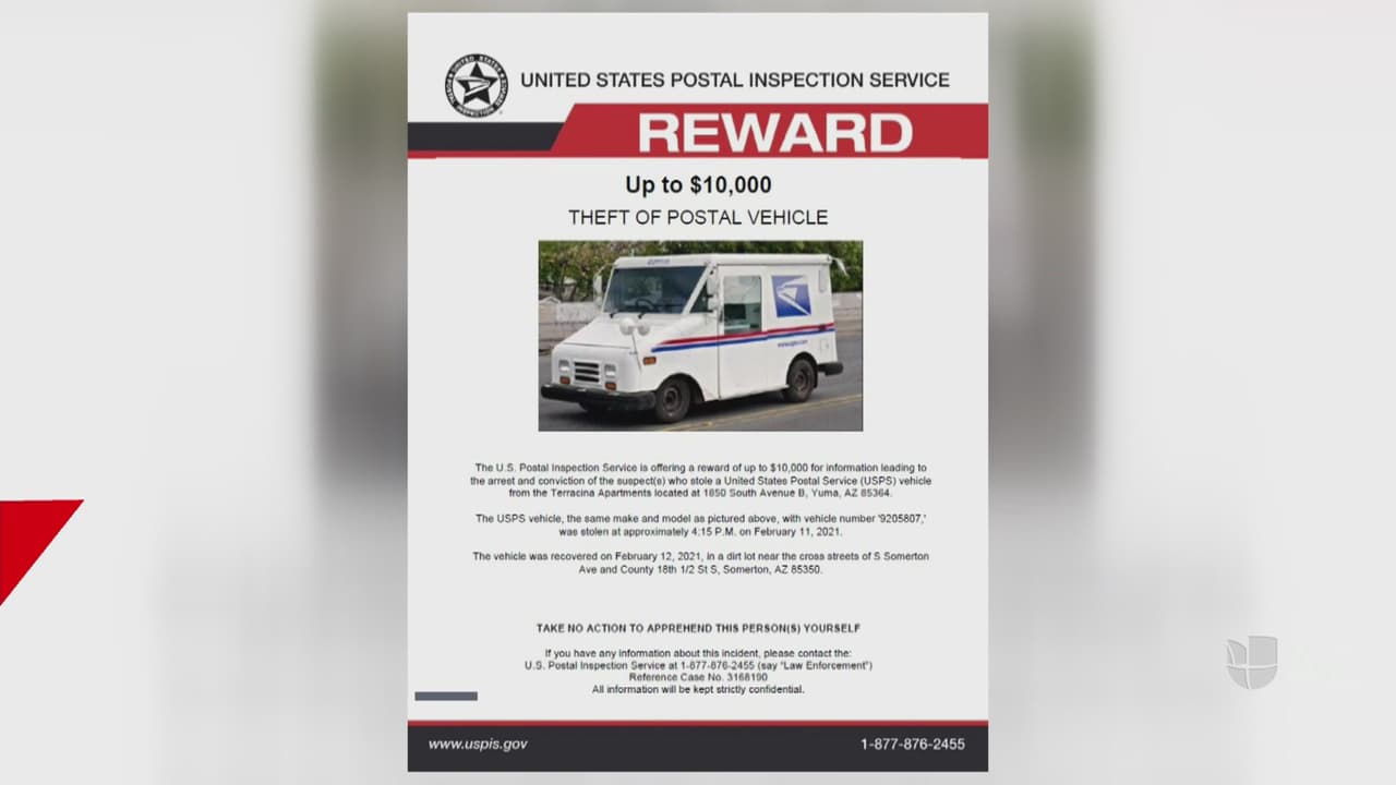 El servicio de inspección postal informó que el robó del vehículo federal ocurrió el 11 de febrero a las 4:15 de la tarde por la cuadra 1800 al sur de la Avenida B en Yuma, Arizona en los apartamentos Terracina.