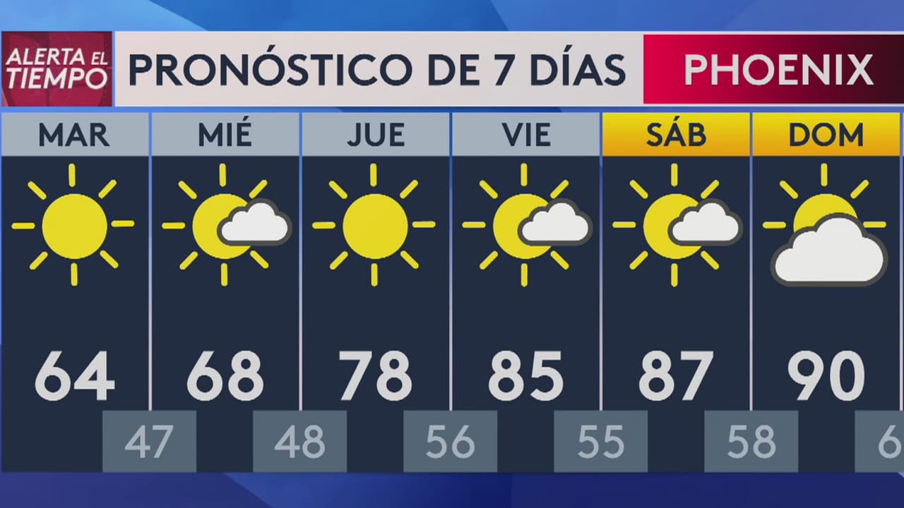 Para este martes, en Phoenix y sus alrededores se esperan temperaturas máximas cerca de los 69 grados Fahrenheit y mínimas de 47 grados. No se espera que estas temperaturas frescas duren el resto de la semana. “Después de hoy veremos una fuerte tendencia de calentamiento con máximos de 80 ºF para el jueves ... y mínimos de 90 ºF para el domingo” indica el Servicio Meteorológico Nacional de Phoenix.