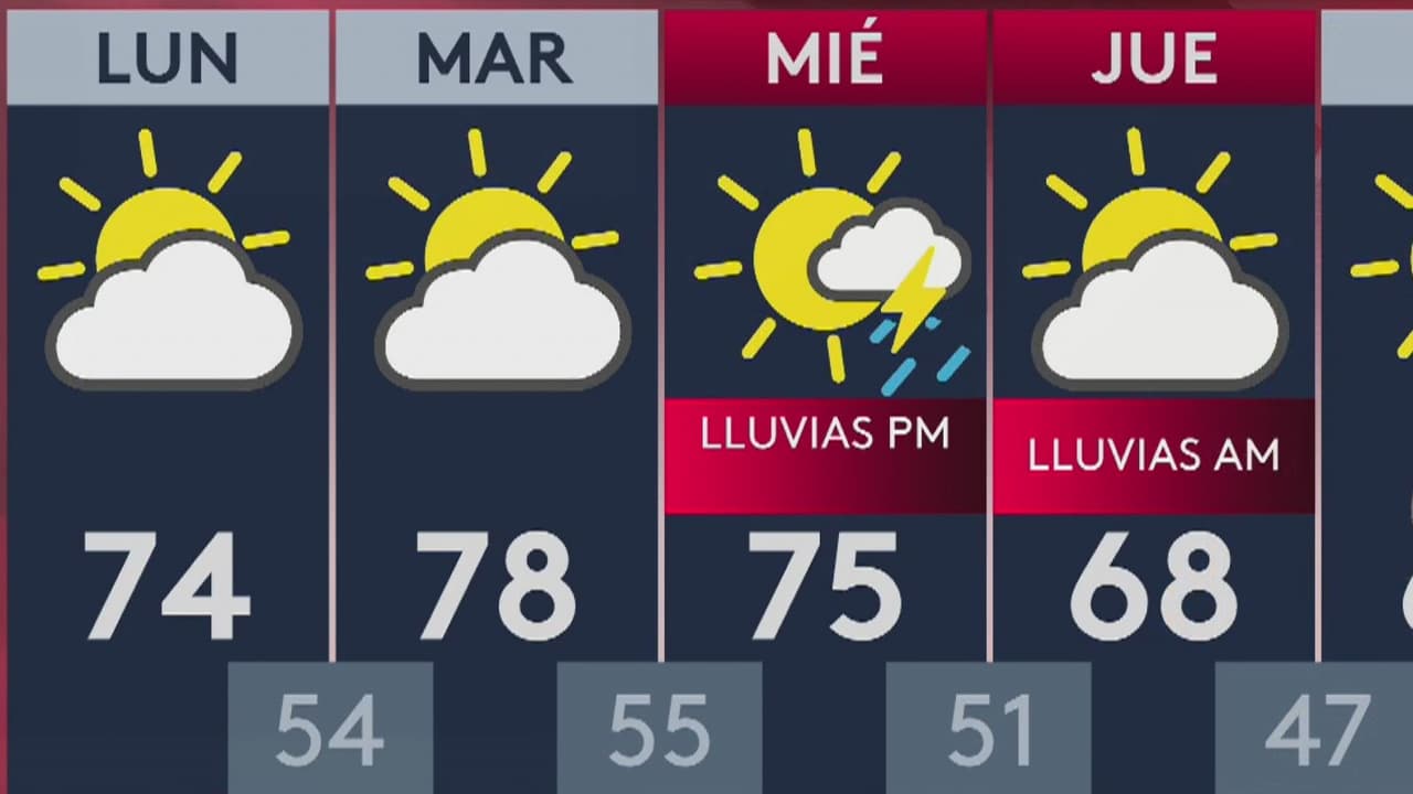 Para este lunes, en Phoenix y sus alrededores se esperan temperaturas máximas cerca de los 76 grados Fahrenheit y mínimas de 52 grados. “Mucha incertidumbre con respecto a las posibilidades de lluvia para el miércoles y el jueves, pero en este momento estamos viendo un 20-30% de probabilidad el miércoles y luego un 10 a 20% de probabilidad el jueves”, indica el Servicio Meteorológico Nacional de Phoenix.