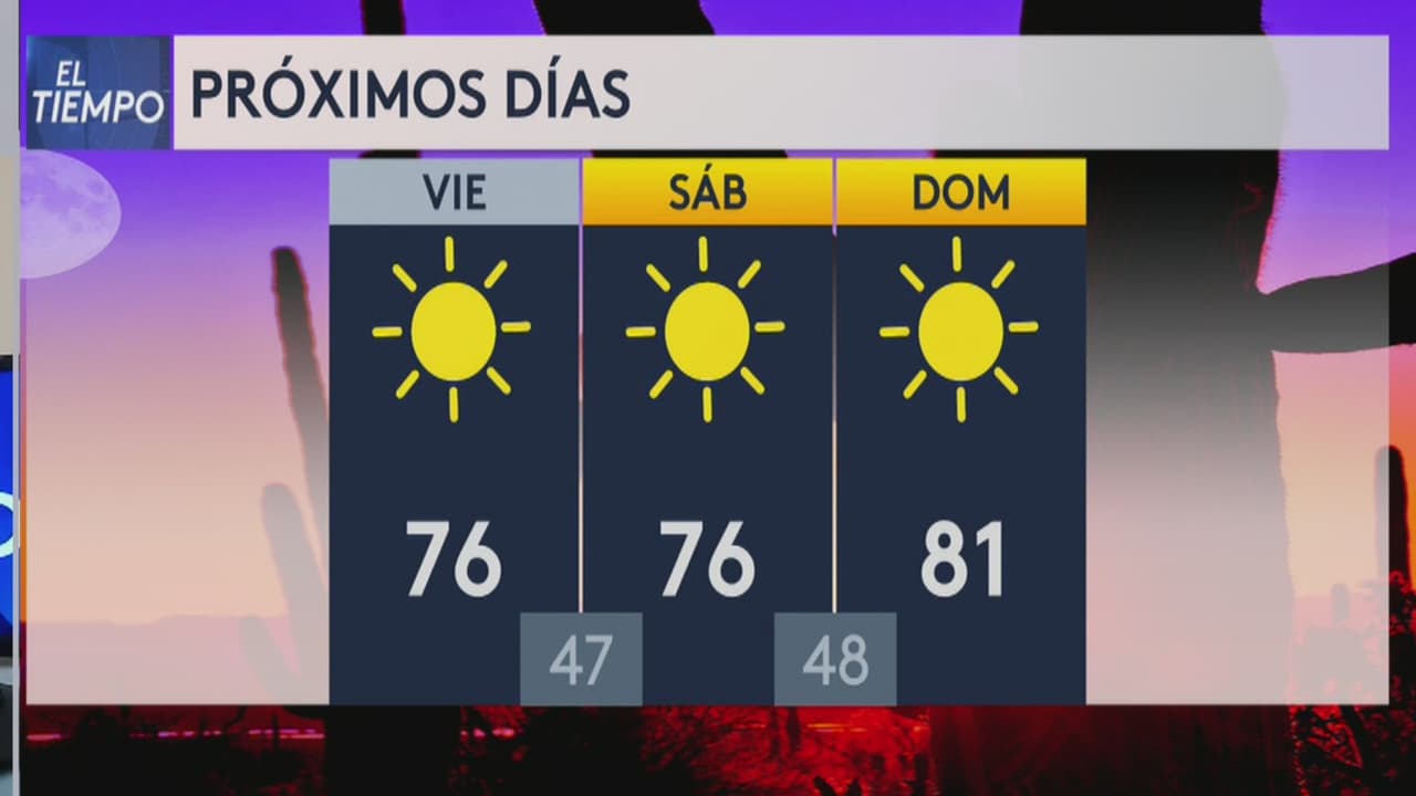 Para este viernes, en Phoenix y sus alrededores se esperan temperaturas máximas cerca de los 76 grados Fahrenheit y mínimas de 45 grados. Se espera que para el domingo las temperaturas estén cercanas a los 80ºF y luego el martes de la próxima semana lleguen a 86ºF, según el Servicio Meteorológico Nacional de Phoenix.