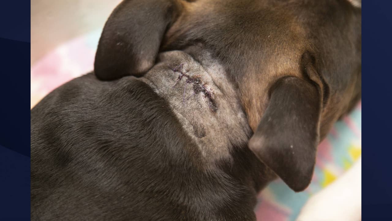 Se reporta que el perro tenía varias heridas, que incluyen una costilla rota, una lengua perforada y tener una laceración en el cuello.