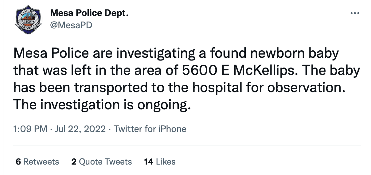 La policía de Mesa publicó que el recién nacido fue encontrado este viernes en una casa cerca de McKellips y Recker Roads.