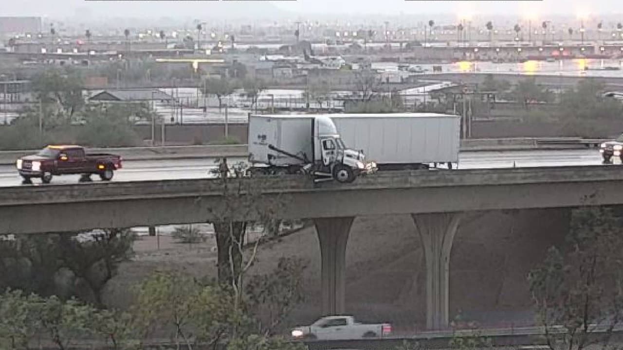 Cabina de semirremolque queda colgando de un puente en Phoenix