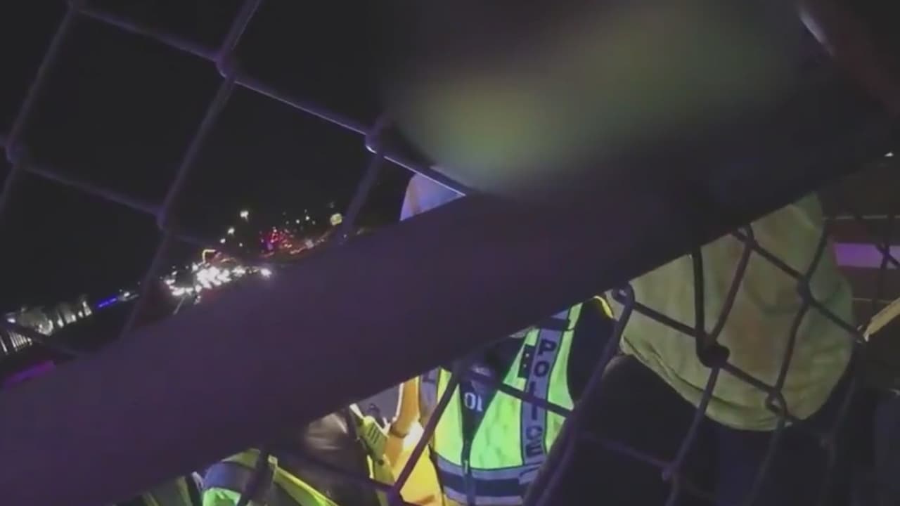 La cámara corporal de un oficial captó los intentos para evitar que una persona se arrojara desde un puente. Tras varias horas de negociación lograron persuadirlo del suicidio.